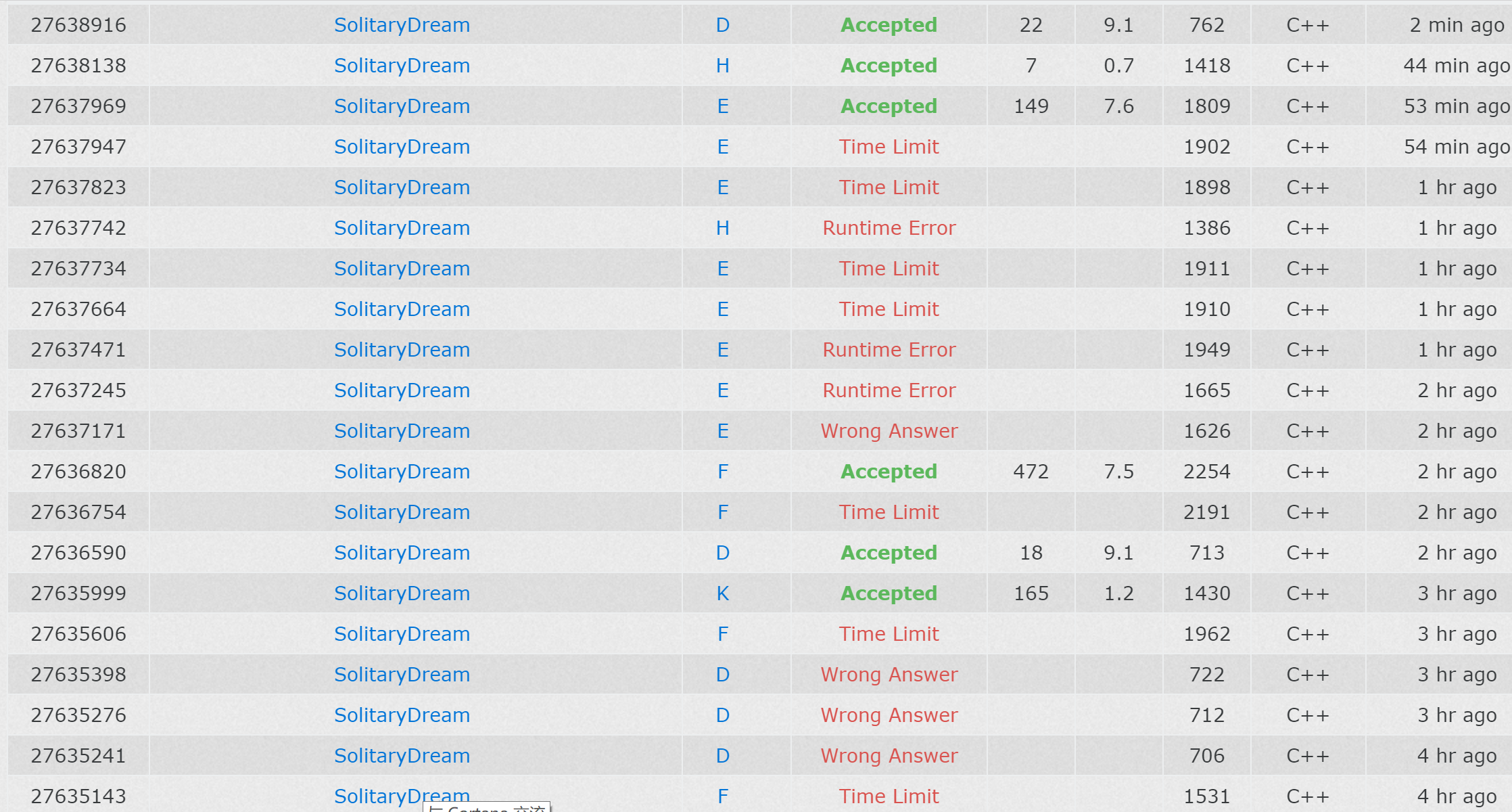 今天有点小菜,貌似全是签到的场自己就有些卡。D第一遍写错了也挺离谱的,最后过了也有些运气成分,题没写完挺可惜的吧。