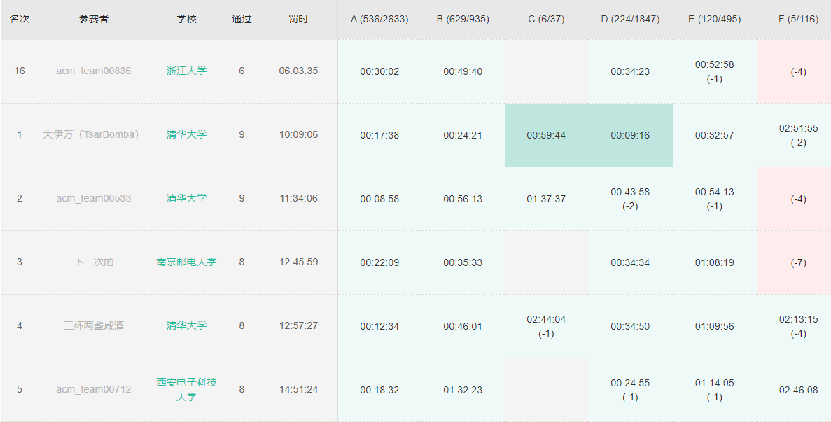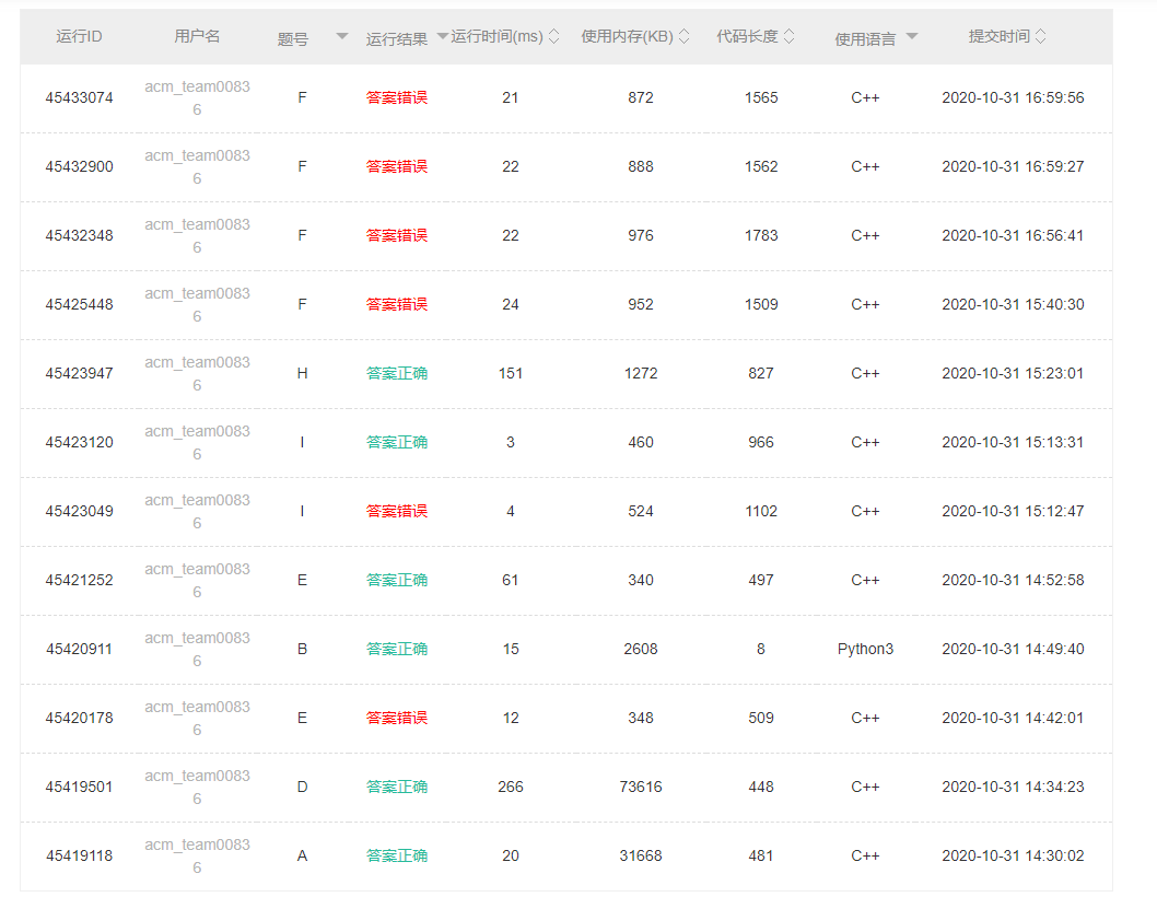 开场登陆不上去,要到账号后打印题面又很麻烦,卡了很长时间,'''A1Y30''','''D1Y34''','''B1Y49''','''E2Y52''','''I2Y73'''。H枚举了几种题意选了个能过样例的题意上去写,'''H1Y83'''。