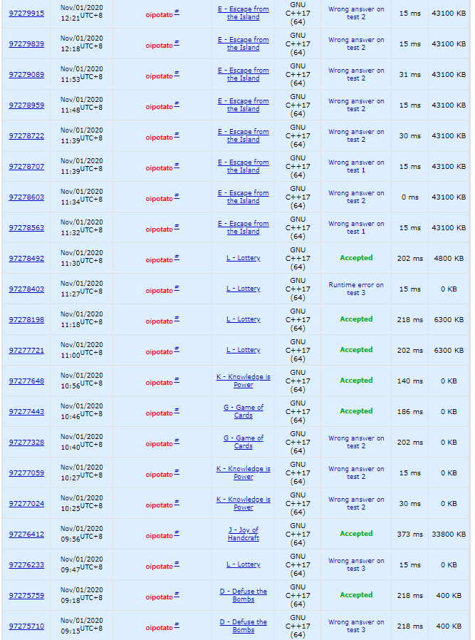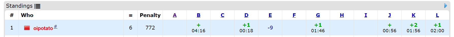 开场签到D2Y18,J1Y56,cxt写L提交后WA了,pb写K的分类讨论WA了,yyc想G的博弈发现想简单后开始推sg,WA了一发全是0后G2Y106,pb改好后K3Y116,cxt讲给pb和yyc都查不出错,于是define int long long,L2Y120。yzc查出是右移可能会产生负数。