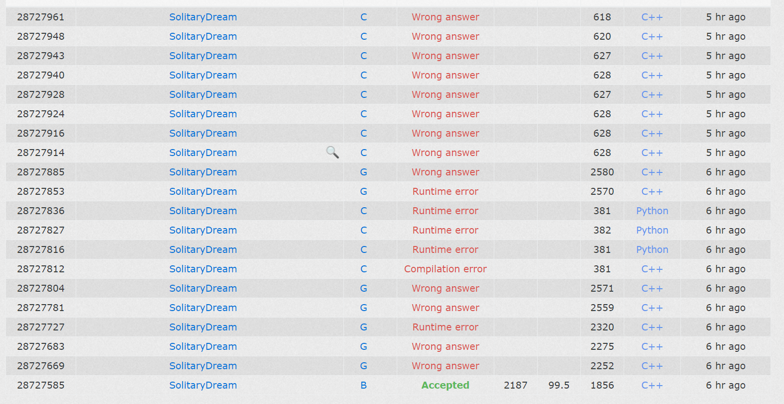 cxt和yyc讨论F,然后想了个分两部分做的做法,感觉复杂度很对,提交T了,加了个记忆化搜索不知道为什就过了。F2Y189。