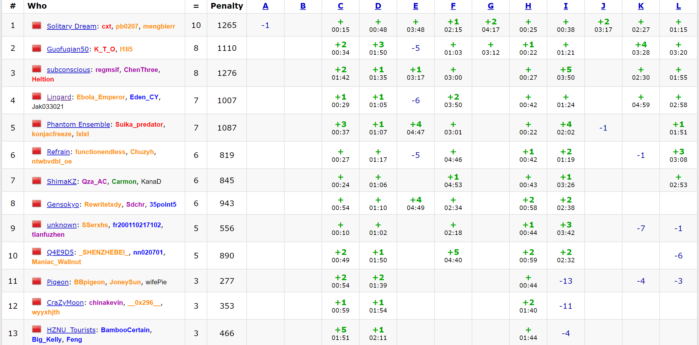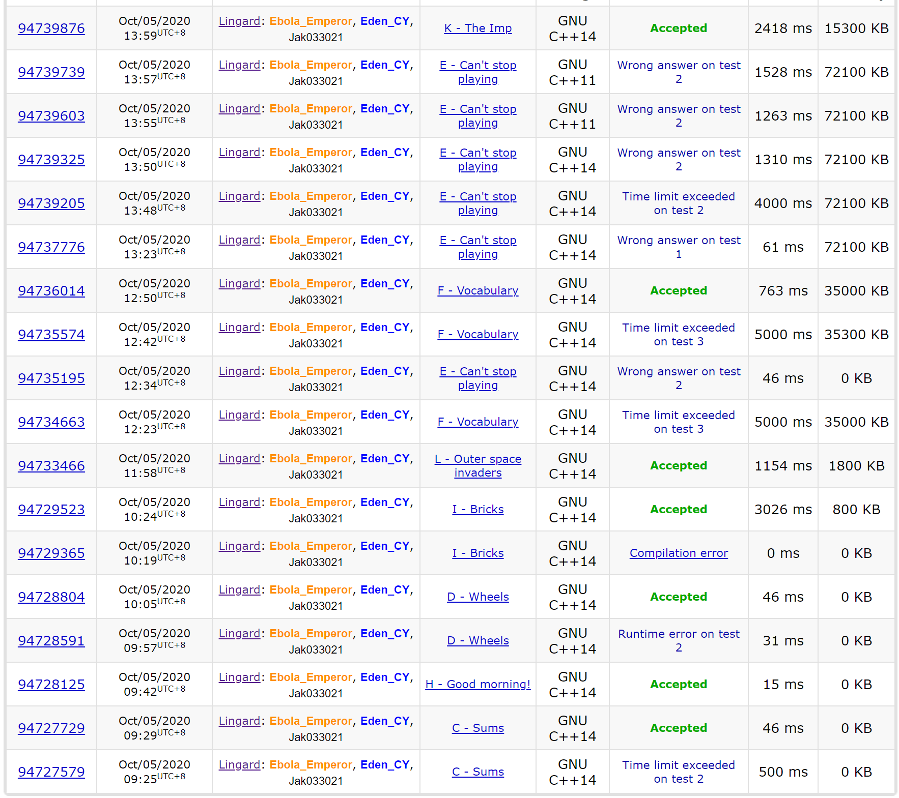 这场结果不错,最大的错误在于SZY居然上机了半小时!!! SZY在完成代码能力飞跃之前不能上机,这场签到比较顺利,进入中期后SZY F上机半小时写不出来,换Eden_CY上机,随后SZY想出L,封榜前CY和Ebola写出了L和F,封榜后一开始跟Ebola一起调E,爆了5发调不出来,285Min时CY表示K10分中内能写完,感觉E前途渺茫,决定让CY上机RUSH一发,299Min惊险过题。