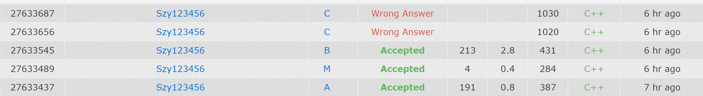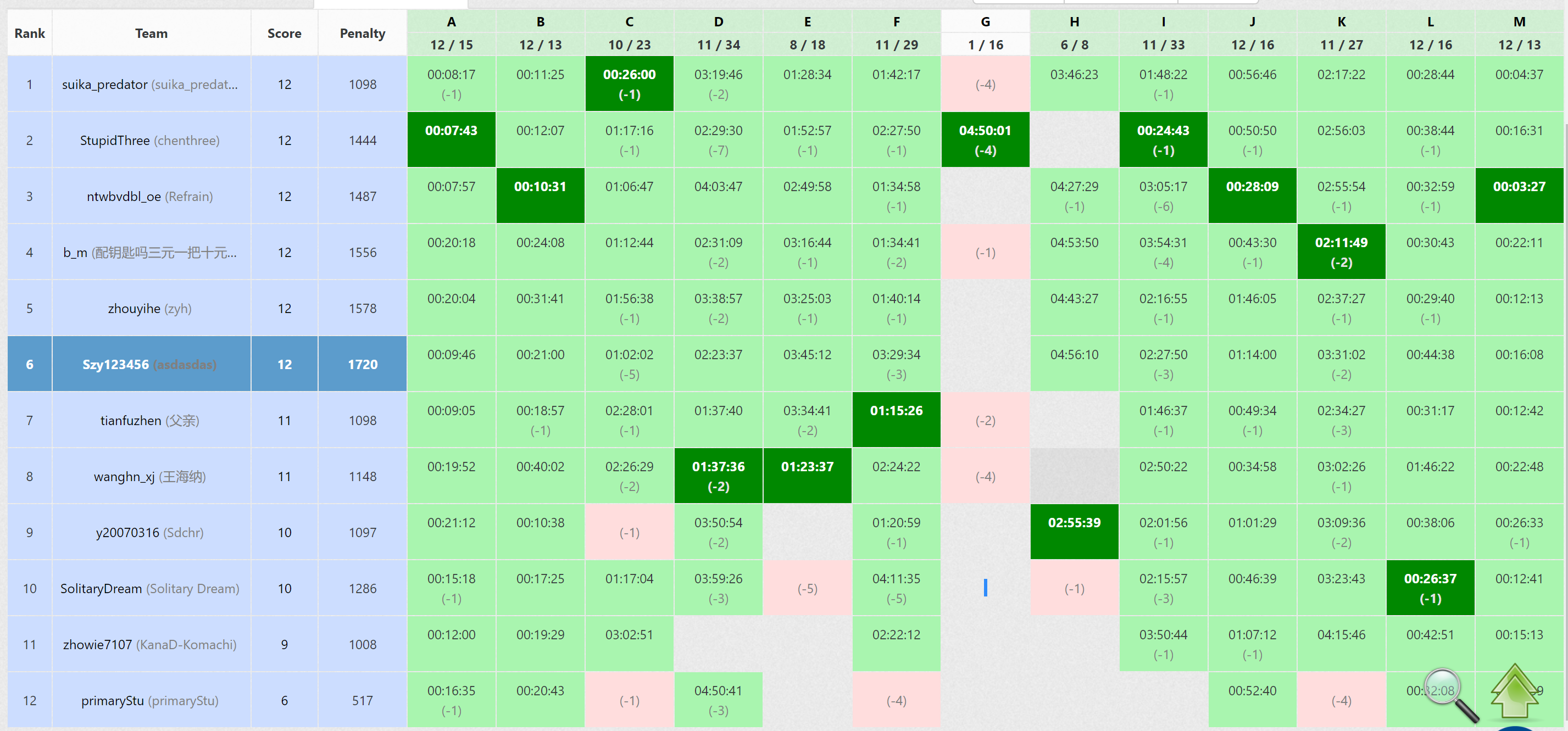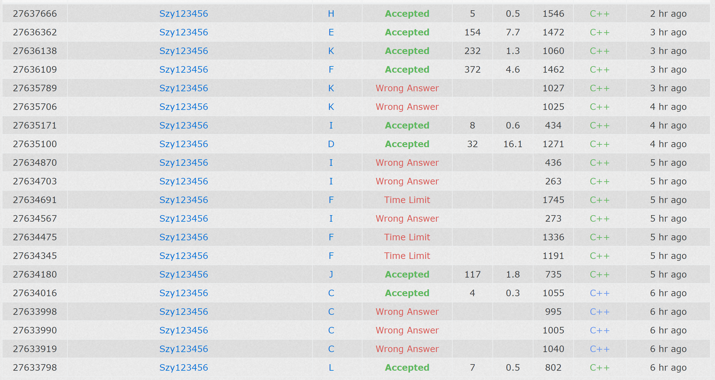 (Szy) 这场比赛之前我有现场打过,不过当时题目基本都是学长写的,今天上来看到自己写了两次的C,上去少判了一个细节,以为是读入的问题,爆了6发,当时太冲动了,随后队友开始卡F和I,我出了D,3小时30-45分我们同时开出了手上的FIE,随后三人主攻H,CY表示会了,由于十分相信CY的代码能力,让CY上机,4H56过了H,总的来说打的还不错,中前期太卡,最后CY单开的时候应该给他足够的支持。
