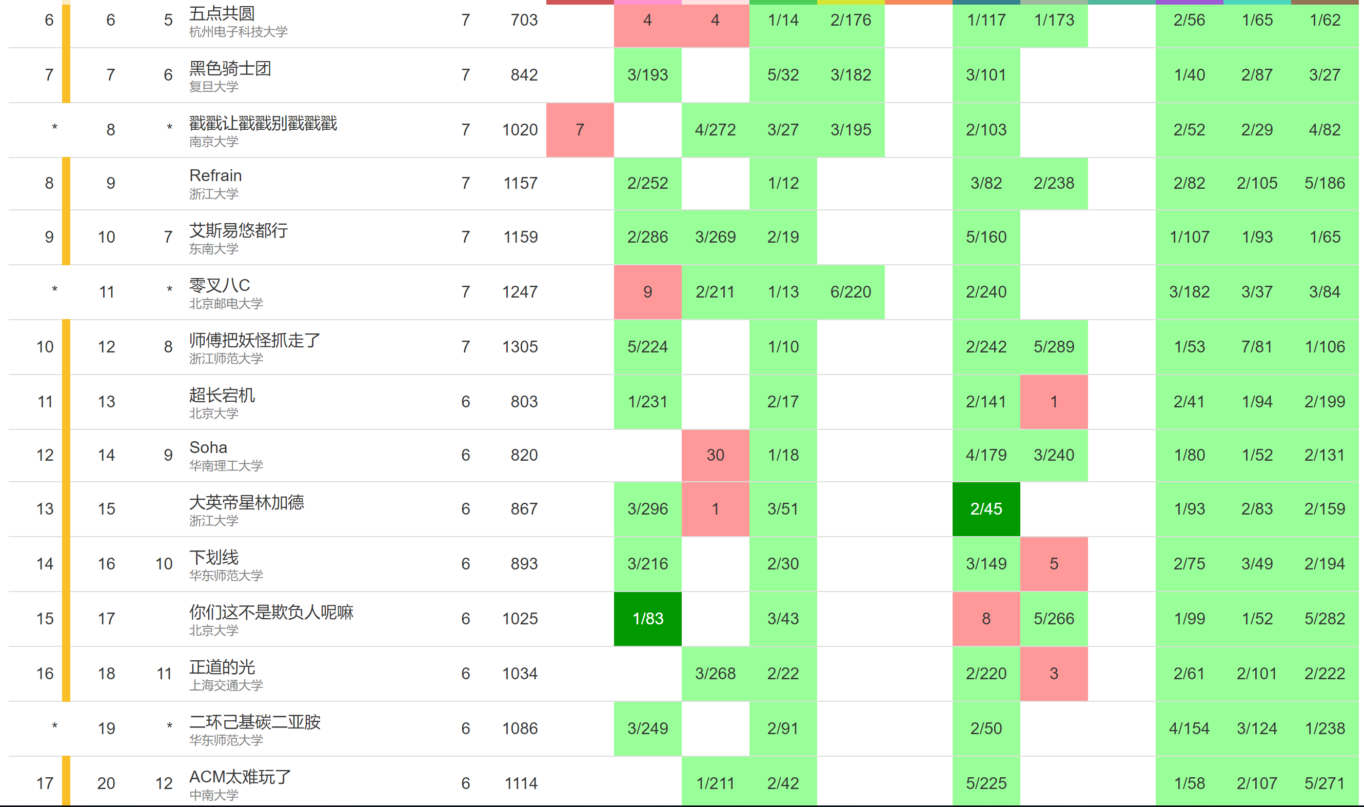 过程比较揪心,开场发现D是签到题,遂Cy开D,写了一半发现有问题,遂换Ebola上机开D,我和Cy讨论G,Szy表示这东西应该打个表能看出来,于是Cy打了个表,并发现规律,此时Ebola D Wa了两发,Cy G Wa了一发,之后Cy调了调过了G,发现拿下了G的First Blood,此后Ebola也过了D,之后Ebola和Szy讨论K,发现会了K,K是一个简单的构造答案,于是Ebola上机K,但是Wa了,换Cy上机写J,Szy和Ebola机下调试,Szy突然发现还有一种情况没考虑到,于是让Ebola改了改过了,Cy也很快过了J,Ebola和Szy讨论出了L,让Cy上机写,随后开E,Szy表示这个E以前见过相似的题,并报出了正解,但是忘记了怎么证明,心里总觉得慌慌的,跟Ebola讨论一下,Ebola表示也不知道怎么证明,很慌,于是Szy考虑到手上还有大分类讨论H,于是暂时放弃了E,表示以后再说(真后悔),Cy过L后,三个人看到剩下的题B题过的最多开了之后发现B题是个DP,于是继续让Cy上机,Szy在机下推H,但是脑子总晕晕的(周中发了点烧,身体不在状态),推不清楚,特别是看到Cy在机上非常痛苦,更加慌张了,此时脑袋像爆炸了,既没办法集中精力去证明E,也没有心情去把H推完,于是就在尝试安慰Cy和挣扎之间度过,真真切切的感受到了考场的压力,之后Ebola表示会C了,于是让Ebola和Cy轮流上机,最后B调出来了,C没能调出来。赛后跟cjb交流了一下,发现我的E就是正解,代码也不长,更加揪心了。