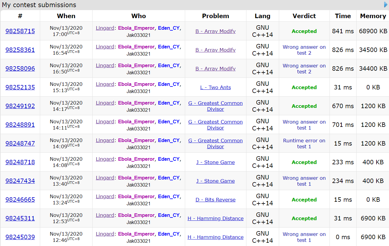 这场有些卡,签到HDGJ花了两个小时,在这个过程中,我们常常没想清楚就上机,这给了我们一个很大的教训,之后Cy凭借个人能力很快过了计算几何L,我和Ebola也推出了B的式子,随后Ebola上机写B,但我和Cy都没想出A,Ebola调B虽然不顺利,但是最后也还是调出来了,差了个A.