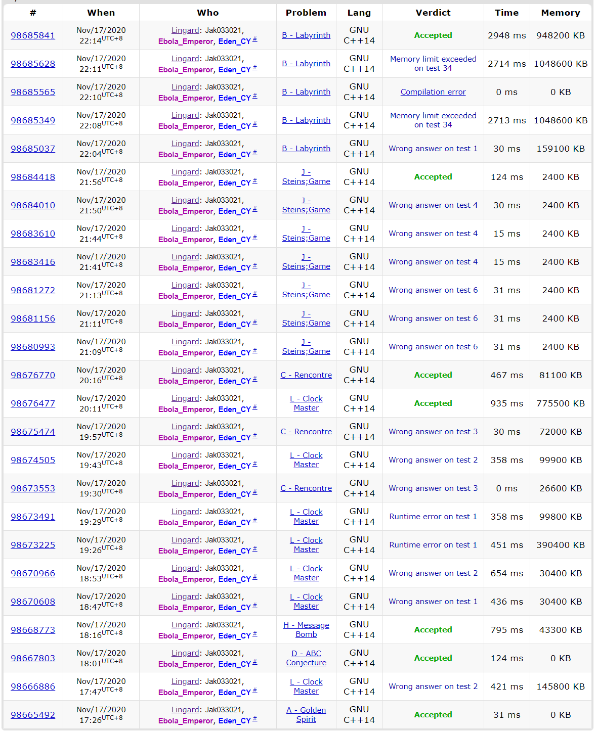 然后到点了,Ebola的精神状态差不多恢复了,接下了Szy的B题算法之后就开始上机,这个很快啊,就写完了,然后过了样例。但这个CF它又不讲武德,我交上去,又WA1了,逼我Custom Test,过了之后MLE34了。这时候离结束还有4分钟,我想不到到底是哪里错了,仔细检查之后,是因为我new的数组会爆掉。我大意了啊,没有算,然后自然就是传统码代码,替换、全部替换啊,还有10秒,按照传统ACM点到为止,已经是认栽了,但是很快啊,我在最后2秒交了,过了