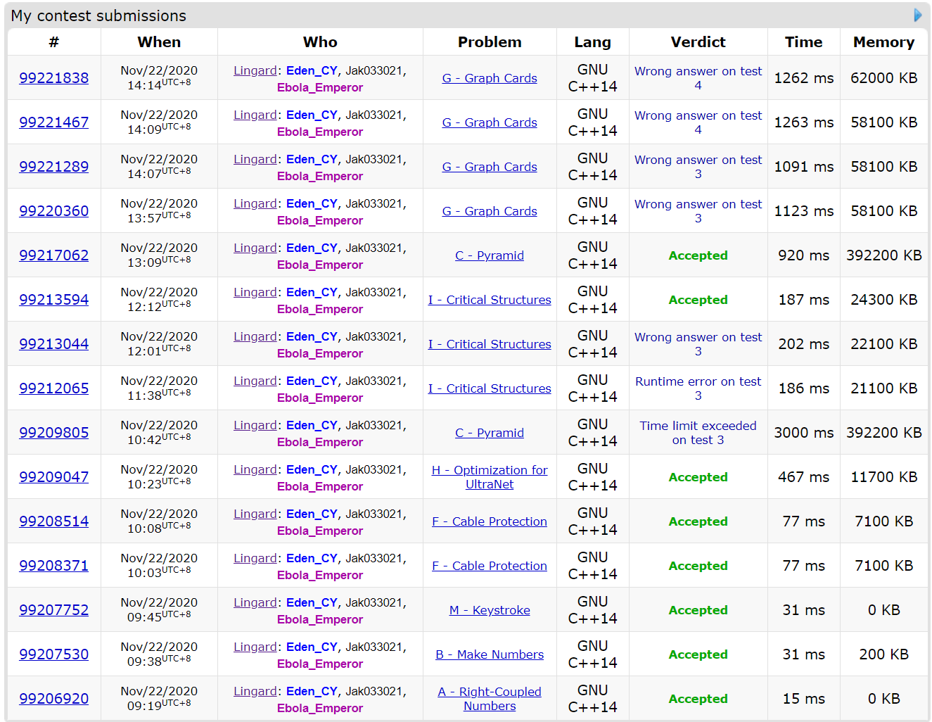 比赛前一个小时非常顺利,连过五个签到题,其中Szy写了3个!!!,刷新写题量记录,之后Ebola一发C,T了,本来时间T=20,n=10000,Tn^2,就以为是自己算法的问题,想着如何优化成NT,Cy则开始卡I,接近三个小时的时候Cy过了I,然后三个人一起想C,也没什么进展,Szy表示要不卡卡常,结果居然过了,学到许多,最后一个小时手上有K和G,Szy对自己代码能力没自信,于是让Cy上机G,可惜树哈希姿势有问题,Wa了,其实Szy现在代码能力有提升,在这种状态下其实可以上机K.