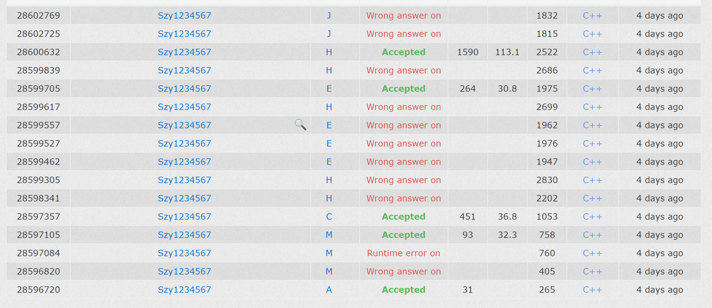 开场签到了A和M,然后cy表示会C,于是cy上机写C,szy想E,cy很快过了C,但szy的E想了一会还没想出来,Ebola和cy写H,后来经过Ebola的提醒会了E,于是上机写E,szy写了写E写完了,这个时候cy的H说再调一调,于是szy下机让cy调一调,20分钟后交了H,wa了,szy上机把E调过样例,结果也WA了,定睛一看原来是break的位置写错了,改了两次才改对位置(-2)再交一发又wa了,定睛再一看,原来是一个小细节写错了(SZY智障),再交过了(-3),之后cy在机上调H,szy和ebola想G觉得G这个暴力有点虚,于是等cy过H后,三人决定写J,三个人讨论了一会推了推式子,Cy上机写,可惜最后没过.
