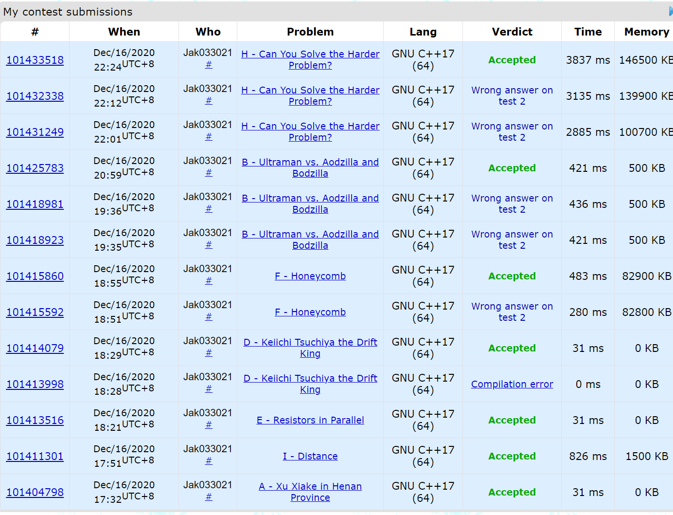Ebola不在,看到ljm在机房摸鱼零时把他叫来打打,一开始很顺利地过了5个签到题,ljm出了B,写完后交上去Wa了,然后Szy对着ljm的程序想了好久,找到了错误,讨论了一会改了改,再交A了,在这期间Szy和cy想出了C和H,一开始cy写C,后来觉得C细节太多改写H,szy机下想J,可惜差了一步没想出来,cy299min过了H.