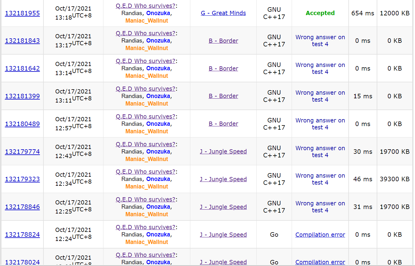 E题糊了一个正方形假做法,yja实现了快两个小时以后发现实际上是个应该五分钟出的DP……,J题写了很久,还一直在WA4……,于是赛后过两题