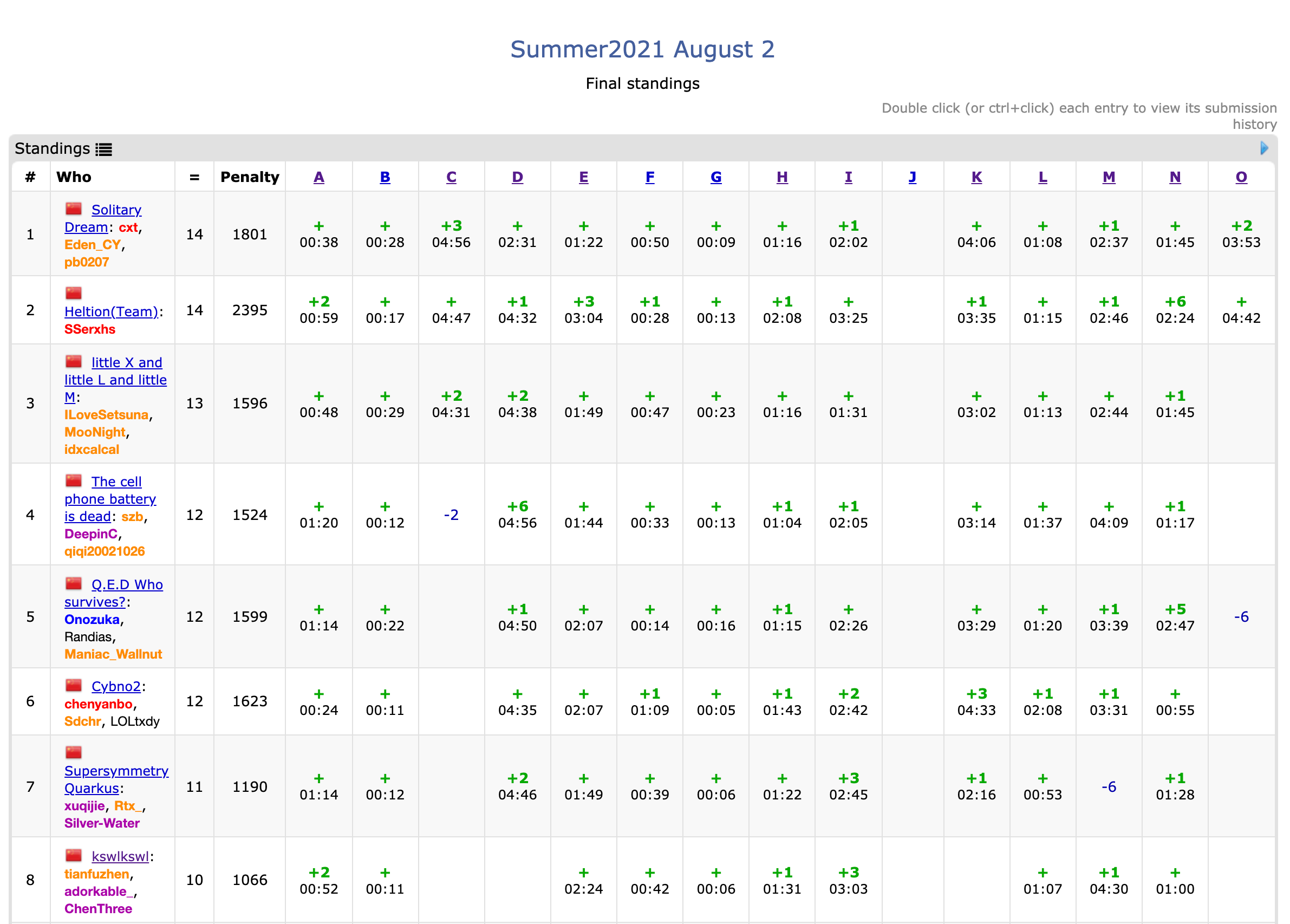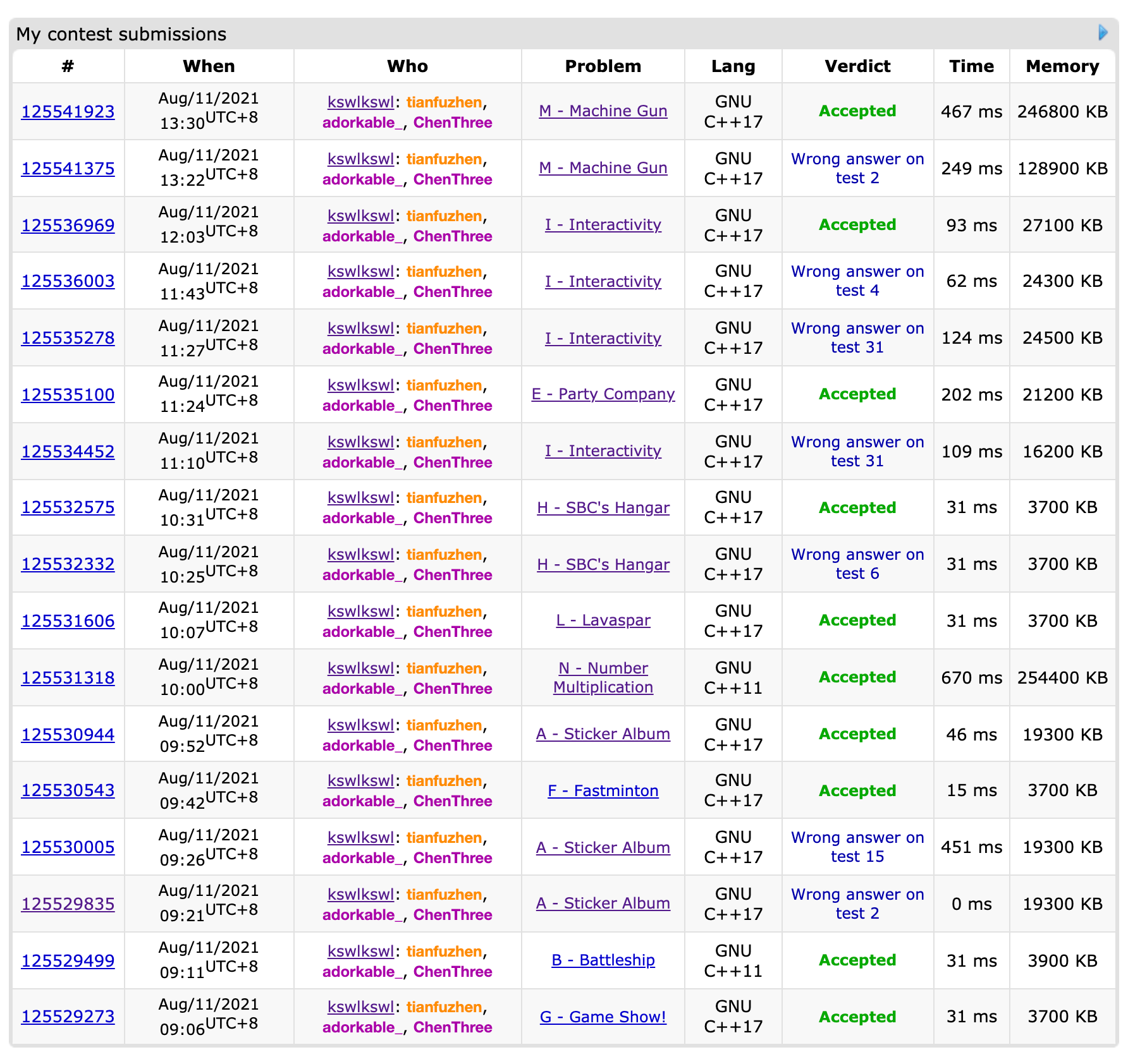 开场lxy签G,wy签B,csr签A数组越界wa了两发。lxy签F,签完来看A代码肉眼查出越界,改完AC;同时wy写N。等wy写N的时候csr口胡LH,上机L1A,H2A。lxy写I同时csr写E,轮流上机E1A,I4A。然后开始罚坐,罚坐的过程中发现M也许能写……封榜后2A。