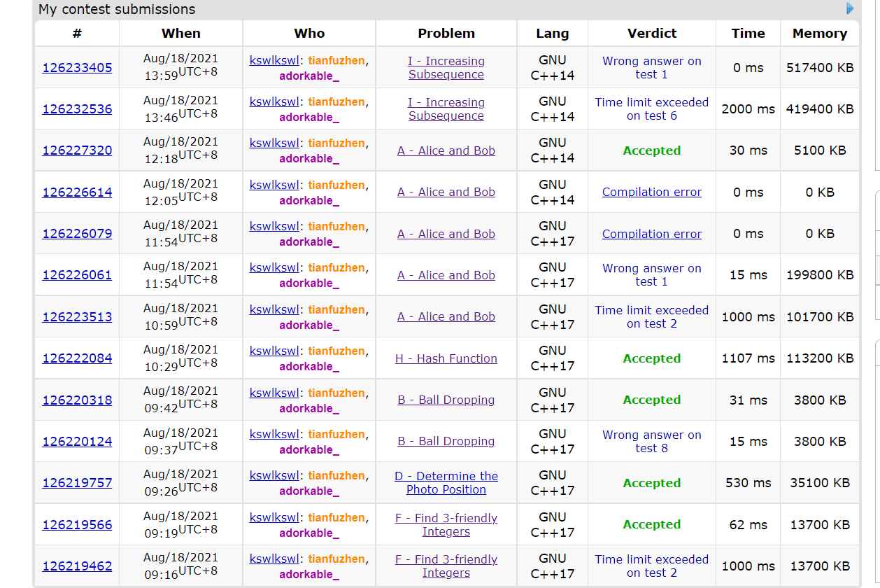 开场签到wa不详之兆,之后签掉F、B、D,wy给出了H的结论,我说卷一卷就过了,她就去卷了一卷。然后我继续看A,看不出来有什么规律,打着打着wy有事跑路了。好不容易打出来了,然后写了个I的n方log,T掉了。别的题看都没看呜呜呜。