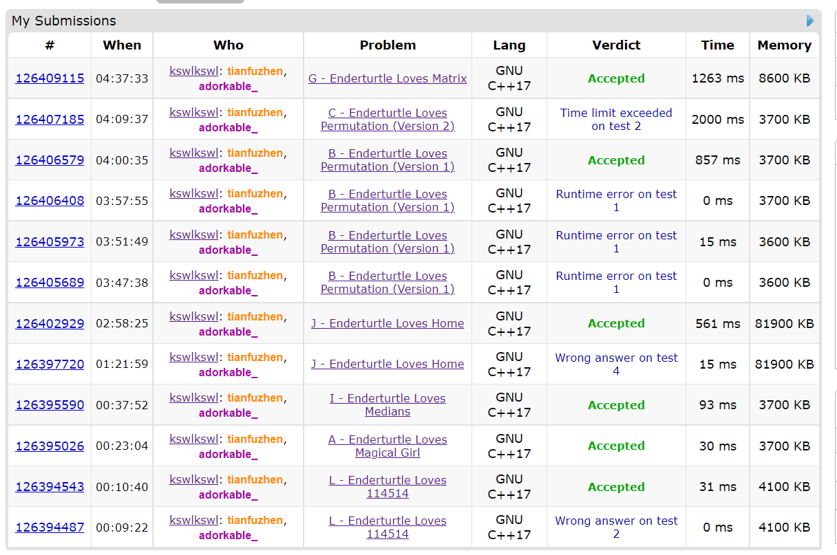 今天刚刚开完电脑,wy就去签L。然后我去签A,让wy看看J。去签了D,然后开始刚J。强行找规律通过。给wy嘴了一下B让她写写,RE了一会过了。这期间看了D、E、G,都感觉不会,G的8e8感觉有点危险,但是没题了。看G不用膜,应该能过,交上去就过了,然后就去清体力了🥰🥰🥰🥰