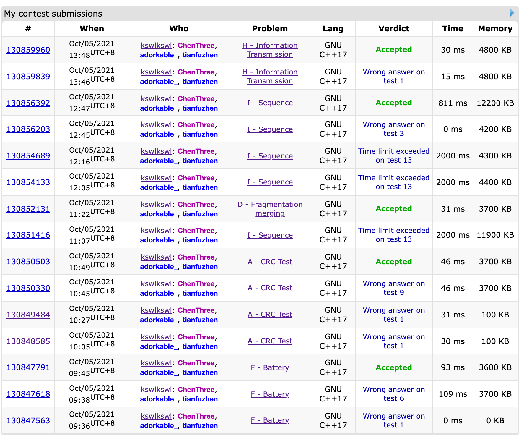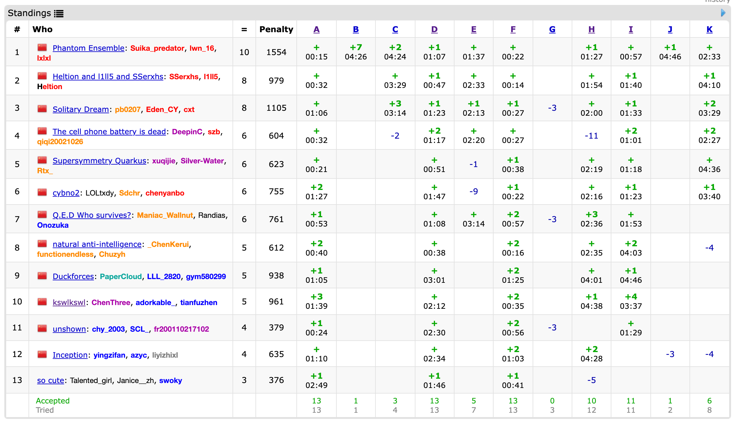 开场lxy写F,然后csr写A,都经过了一些曲折的WA;wy倒着读了KJI后感觉I比较可做,上机写完发现复杂度假了😅;lxy看了看后提出了一些修改但并没有成功,于是先去把D过了;接着lxy回来改I,n*n*log仍旧TLE,最后n*n过了I;此时csr差不多想出了H上机写,但WA了,同时wy和lxy说了E、K的题意但大家并没有什么想法;最后lxy改出了H,csr想出了E但是来不及写完😭。