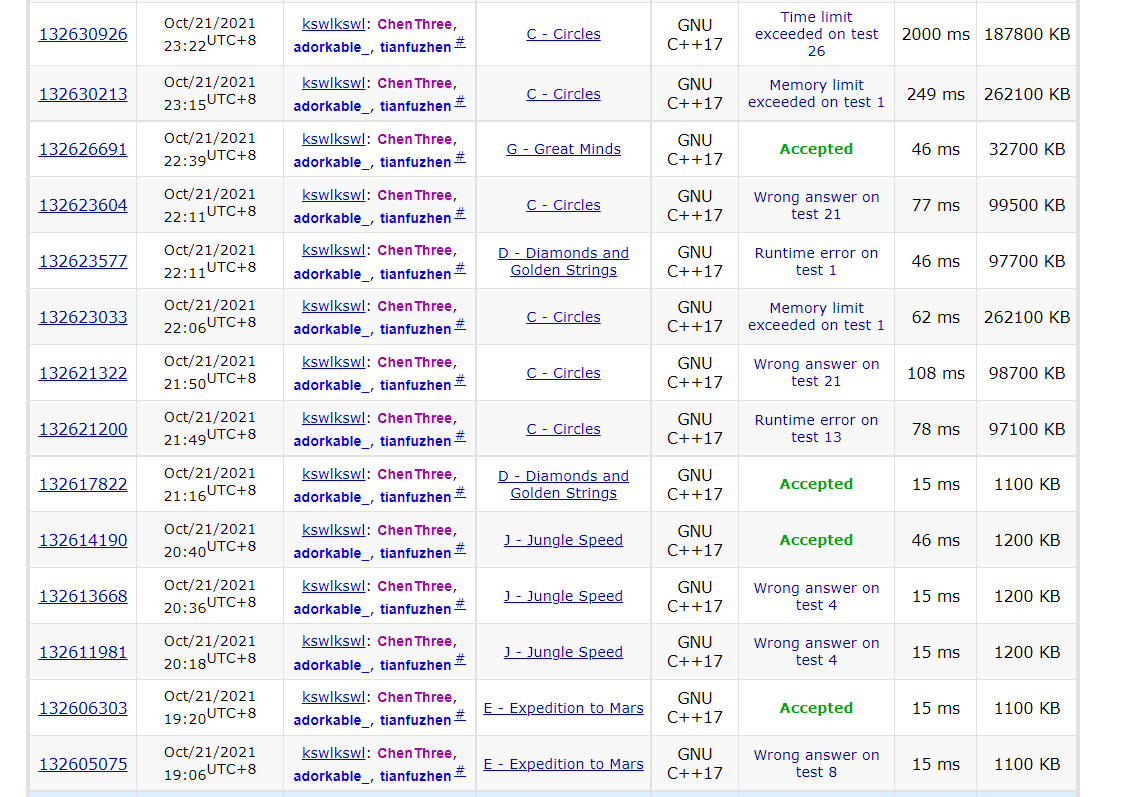 开场大家都各自看题,lxy感觉E可以DP,D了一下好像又D不了了,这时和csr进行了一些讨论,发现好像有固定的一套放法。写了一个DP,交上去WA啦。发现是一个地方还要D一下,就过了。wy开出了大模拟,秉承谁开谁写的原则,wa了几发过了。期间lxy在对C进行一些无用的努力,并把博弈扔给了csr。C好像不懂,于是逼迫csr上去猜结论,过了。想了一个C的做法,当然是美美假做法然后WA了。这个时候开了开A,是题解印象里的网络流...但是不精深网络流被卡死在机上,于是扔掉。csr对G进行了一个数列表的查询,美美通过~。然后没有时间了,写了个C的莫名其妙的暴力,美美TLE。看了现场榜好像前期其实还不错,心满意足,虽然最后还是die了😭😢😢