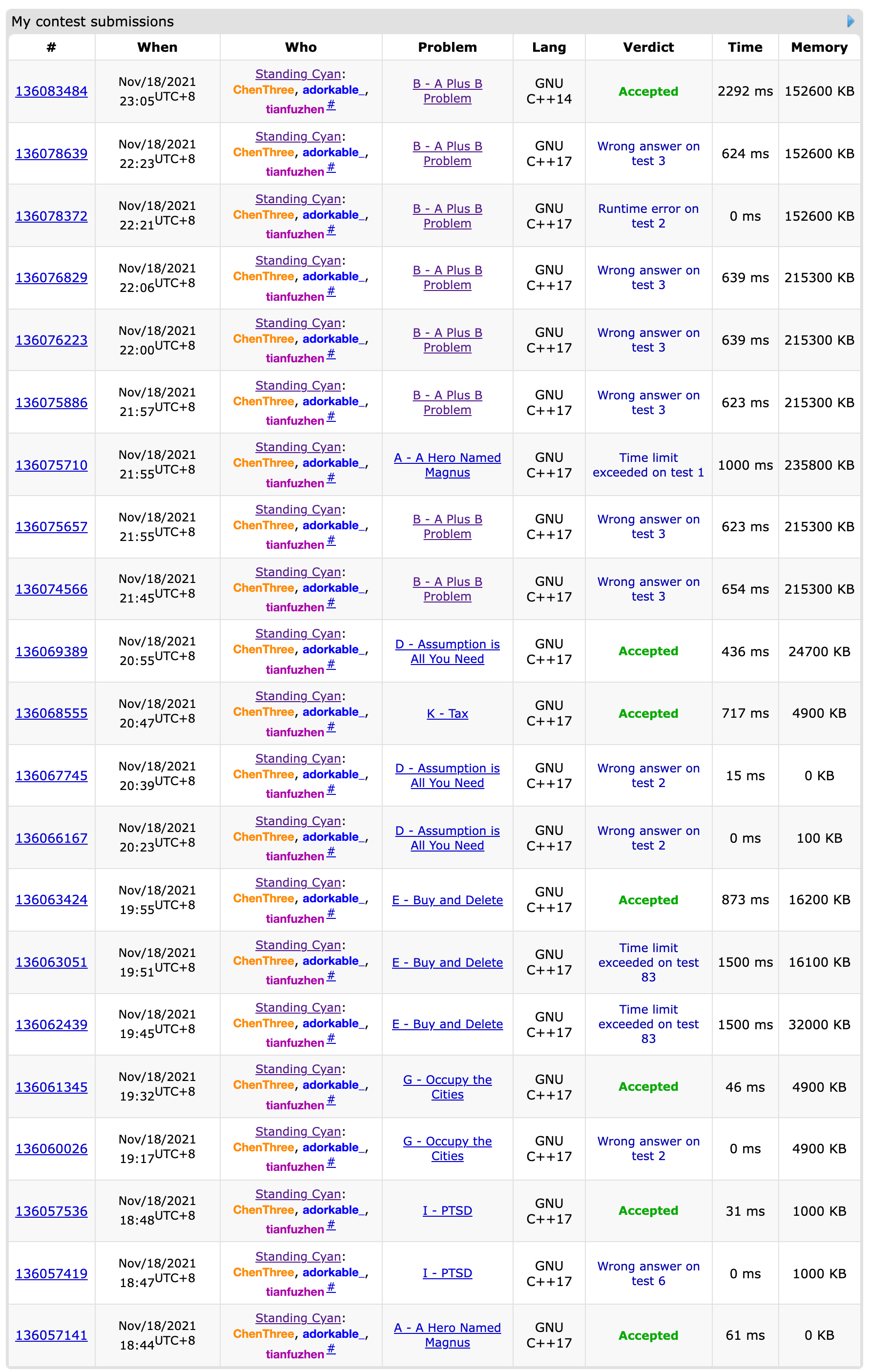 csr感觉A很长,但真的是签到,就去读了,读完就A了。wy出I,忘开ll一发,改完A了。lxy看了E,感觉可做但懒得想,去看了D,想了一堆轻易被叉的做法,写了一半下机。csr开G,WA。于是去想了一下E并开始写,lxy说了G的一个错误,改了A了。EWA了,后面发现是最短路写错了。wy在想D并想出来了一个做法,提交WA。csr去沙发上完了一会想出来了K,交了就过了。期间lxy懂了B但懒得写,上机写了个D的新做法依旧WA。又想起了一个做法后A了。开始写B,csr开始搞J的后缀,想出了做法但lxy在机上比较占时间。B提交WA,lxy下机并和wy开始看错误。发现无数错误中。csr去写J,但是刚刚学比较不太会用。Bde了一个多小时总算过了。csr调出了一个正确的后缀树,但后半部分还是要数据结构,时间已经来不及啦!