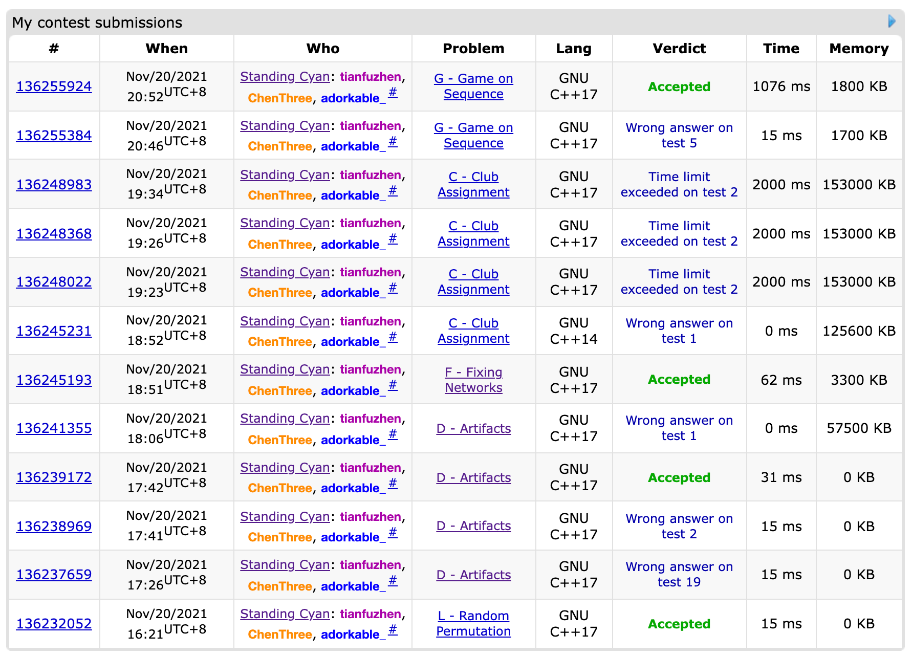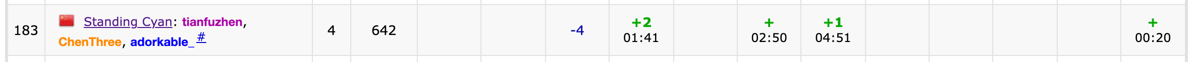 开场wy签L,上机发现和样例输出对不上,三个人尝试了五分钟没有结果。csr试图上机python,发现依旧对不上,冷静思考了一下精度要求测了测样例的相对精度,和lxy决定把wy的代码直接交上去过了。这时候csr宣称A和C都很可做,于是和lxy一人一题并多次交换无果。wy发现了D的签到模拟,上机过不了样例,于是lxy上去写C,csr和wy进行了一个题面的重读。改完提交还是wa了,csr阅读了wy的代码,wy改了两发过了。这个时候lxy继续在C,并建议csr开F。csr跪在门口的沙发上,并在lxyC的间隙把F过了。于是lxy继续上机C,csr下机A。3h左右的时候wy觉得G很好开,于是csr把推了没有啥用的A式子扔给了lxy,跟着学妹跑去了G。lxy从机上下来开始开A,csr继续去门口的沙发上跪着,跪了半个小时似乎想出了一些东西,又上了两个厕所上机写G,还剩9min csr过了G,还剩-20min lxy过了A。美美结束比赛🥰🥰🥰🥰🥰