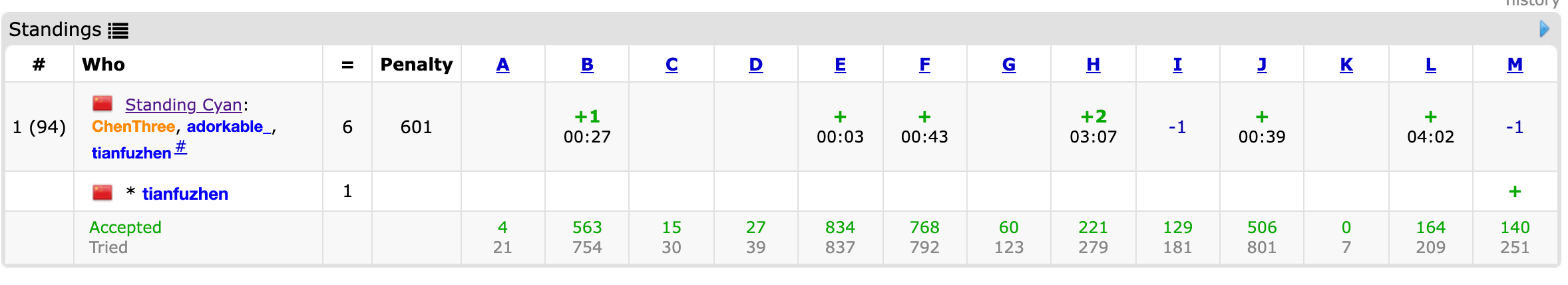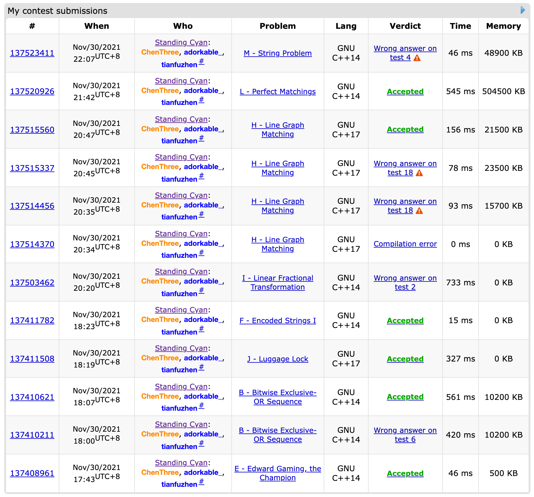 开场lxy一眼发现E,冗长的题面全是某比赛的过程,美美跳过签了个到。csr会了B,但不想写,但又没有题可以写,于是去写了,小WA一发后通过。中间wy会了J,lxy会了F,并声称自己会了G,同时扔给了csrI与L。wy完美签J,lxy写完F,准备写G发现是假的,并逼迫csr去想I。不知道为什么纠缠在了G上,但最终也没有合适的做法。wy出了H,调不过样例让srjj去写了I,WA2。H因为数组开小WA了几发过了。lxy在厕所门口想到了L怎么容斥,并逼迫csr去写树上的DP计数。开始写容斥并扔了字符串给csr。