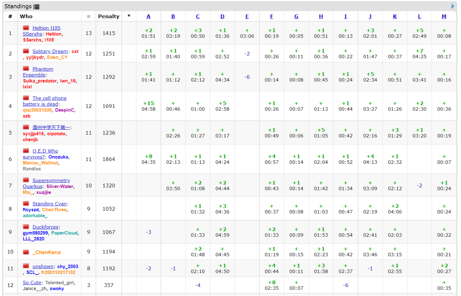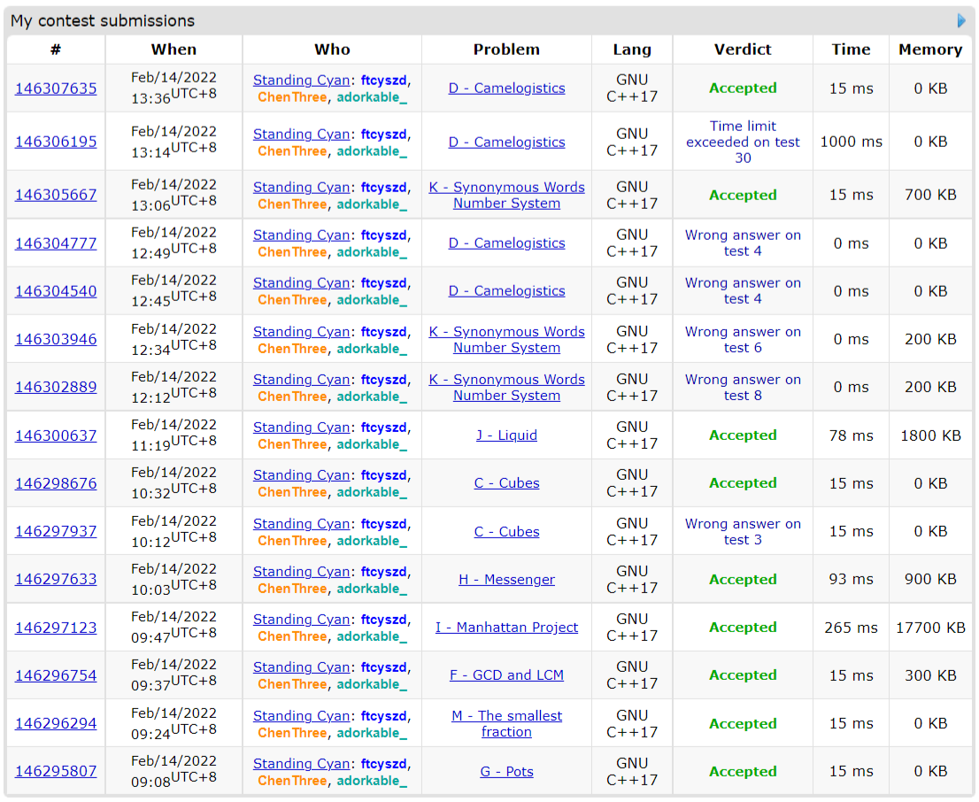 lxy和csr各自都比昨天迟到更久了……csr到的时候wy已经过了G在写M,然后csr写F,wy写I。这个时候lxy终于来了,lxy和csr稍微讨论了一下写了个H。csr猜了C的题意,wa了一发过了,再写了个J也过了。这时候是2h19min。接下来csr开出了K,wy开出了D。艰难地写到最后1h都过了