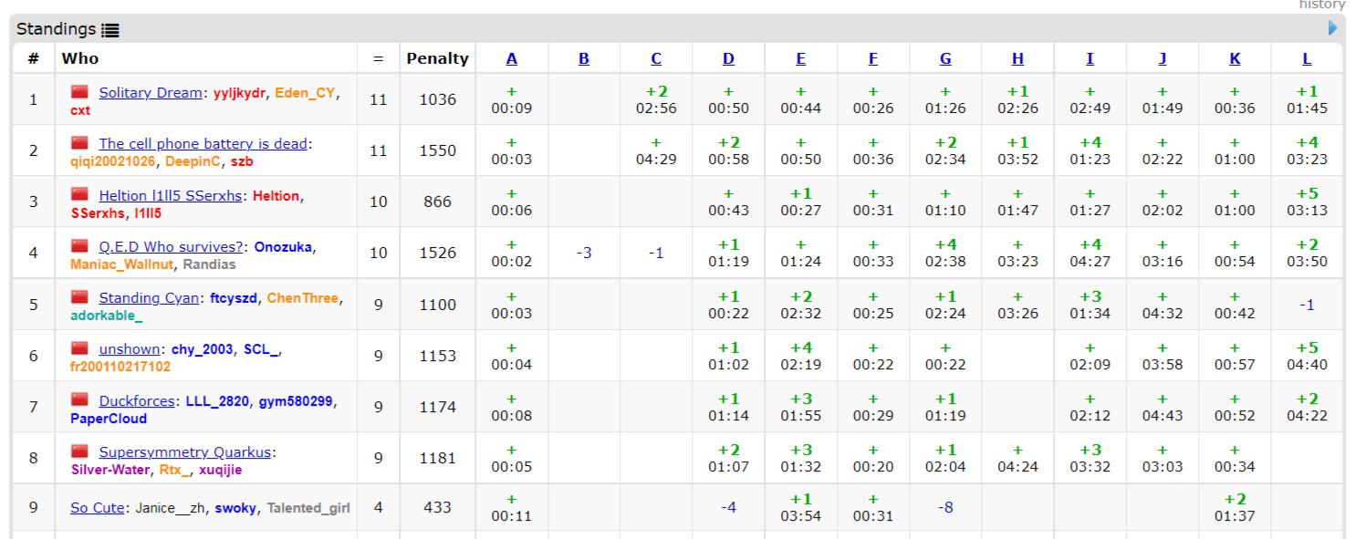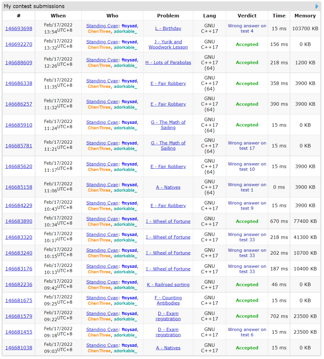 srjj由于身体抱恙没来,但因为线上反而第一个到达。在lxy开完电脑前写完了A,然后写完了D.lxy签F,然后csr写K。在srjj的指导下lxy写了I,虽然好像WA了很多下。wy去写E,然后WA了。lxy写G也wa了,最后两个都是输出位数少了、、、wy写了H,从看着表发呆的lxy这里接过了J。srjj努力拼搏L,最后遗憾WA4.