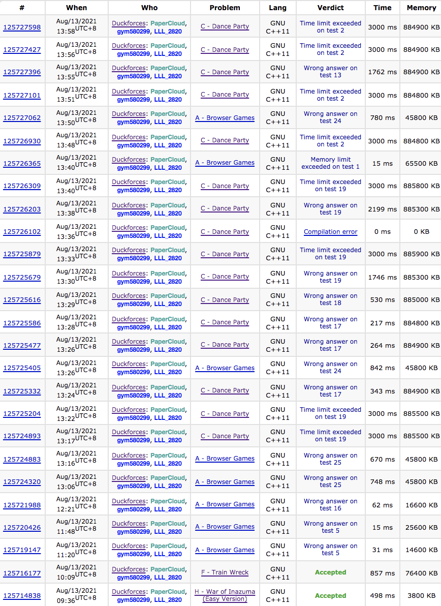 开场各自开题, gym看榜发现H有人过了, xLLLx跑去看发现自己并不能搞定, PaperCloud提出了做法后过了H '''H1Y34'''。gym & PaperCloud 讨论出了F题做法后, gym过了F '''F1Y59'''. 之后看了C, A, J, E. A8 wa&mle , C15信仰random并没有过...