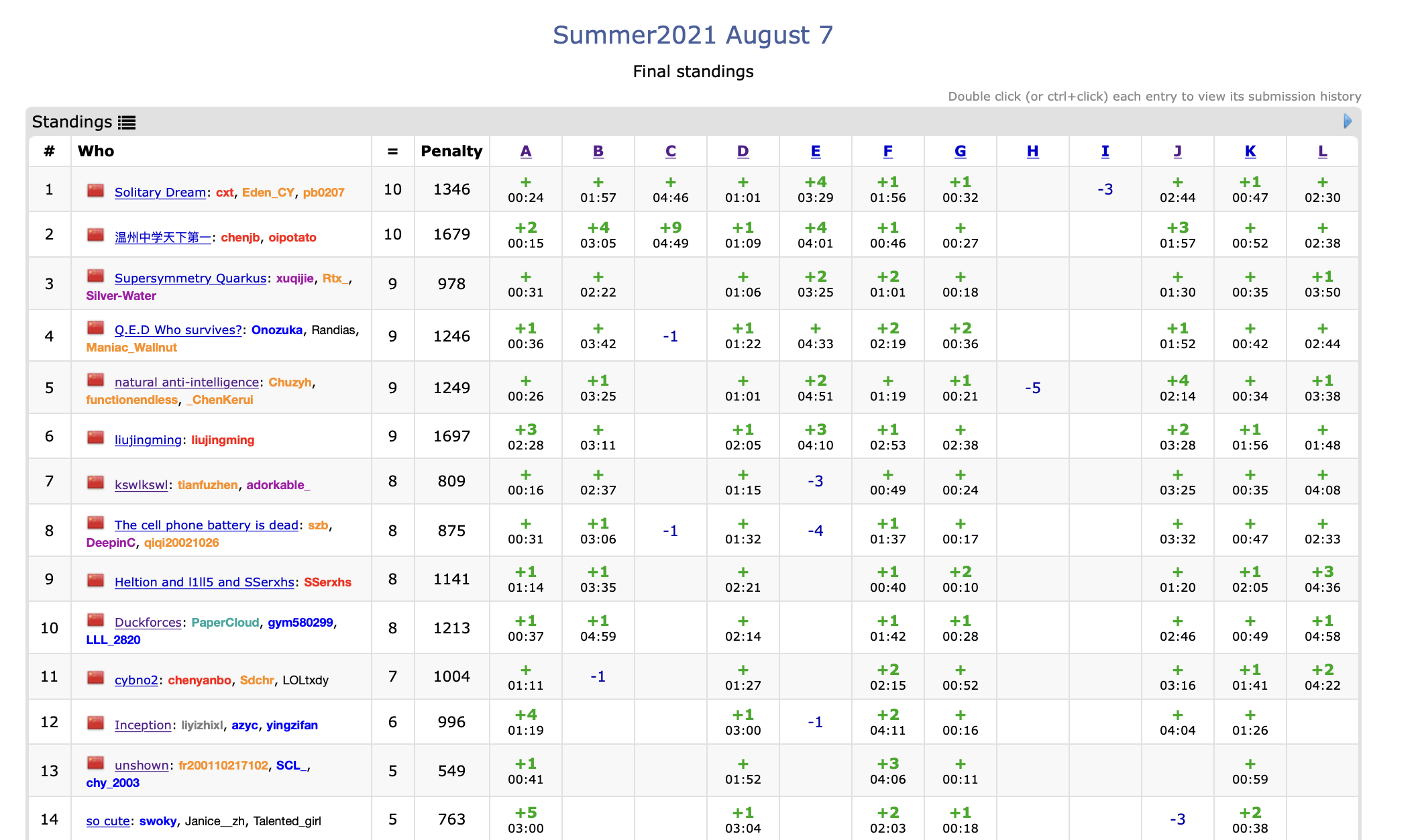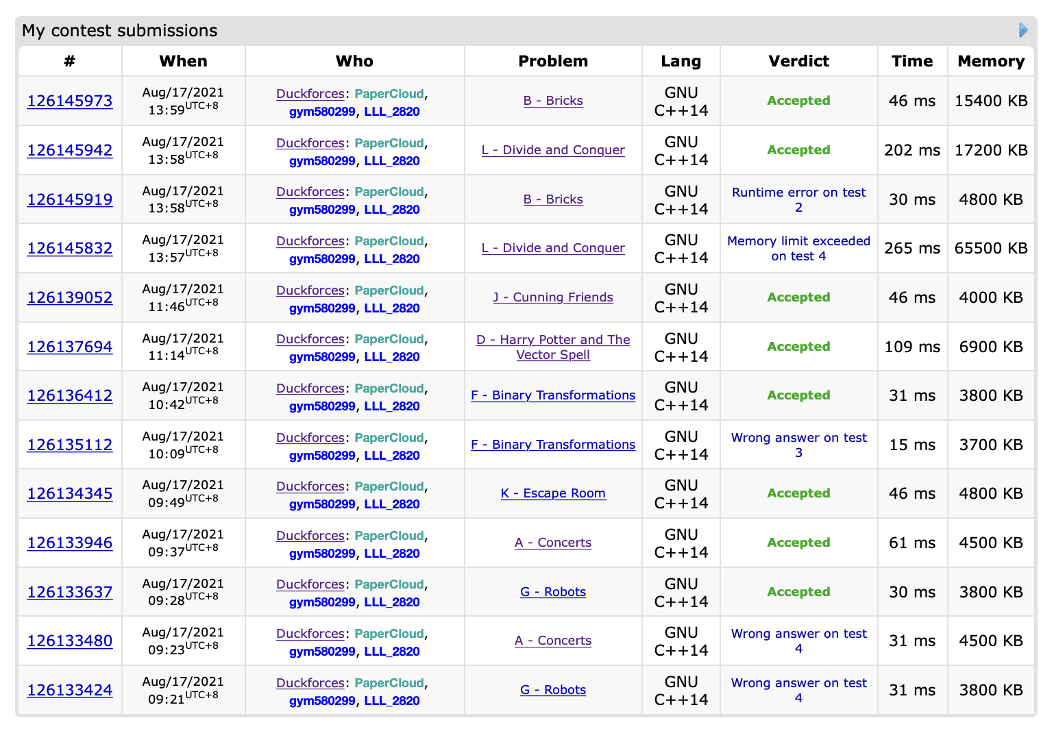 呃,今天就各种不顺啊。一开始看A简单,写完后注意到时限,害怕要卡就把清空改了,然而没考虑好挂掉了。后来看了十几分钟看不出什么,就把原代码交上去A了……后来搞K,好在构造的还算快。然后看F,没想到F一开始的贪心错的。然后盲猜了一个贪心搞上去,居然过了……(但是还是感觉不太好,毕竟不会证明)后来看D题,结果我不知道怎么回事题目看也看不懂,当我看完队友已经会了(还好!)。后来跑去看J,一个博弈题,瞎搞搞,盲猜>=3的一定是后手胜(试图证明过的,看起来好像很对但其实我也不知道有无正确性……)。还好过了。然后就是两个小时的自闭!L题想来想去都感觉想不清楚,dsu也忘得差不多了,临时跑去看板子,幸好队友会写。B题最后一小时搞的,一开始以为可以写了,结果写来写去总是怪怪的,状态弄不清楚,后来就不管了直接想递推,最后几分钟才搞好还因为数组开小RE了一发……不过今天真的可以发个顽强拼搏奖了吧,最后两分钟过了2题诶,打破了那个魔咒!(为什么明明每次都感觉没什么好写的居然还是能写这么长,这真的不是一篇披着总结皮的流水账吗)