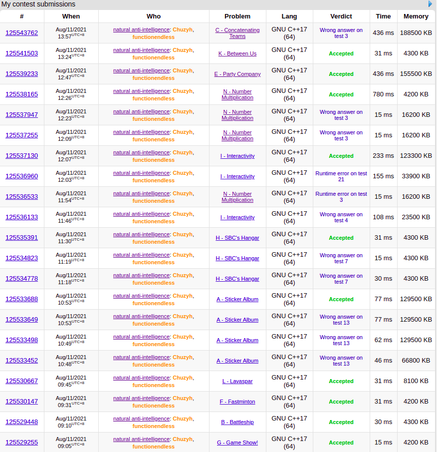 今天czyh单打,ckr在外有事,fx在czyh旁边意识模糊。开场fx从前向后,czyh从后向前。一会儿后czyh跟榜切GBFL,G1Y5,B1Y10,F1Y31,L1Y45。czyh看fx想A看不下去于是开始想A,fx阻止czyh走上一样的错误道路后去看N并且胡了出来,于是两人交替写A和N。在WA了三发后A4Y113,N写好了之后依然在调试。之后czyh又跟着榜切了若干题,H3Y150,I3Y187,之后czyh又把fx踢下去切了N,N4Y206,之后两个人一起写了E和K,E1Y227,K1Y264。最后czyh想出C之后在fx的注视下写完了C但是WA了。