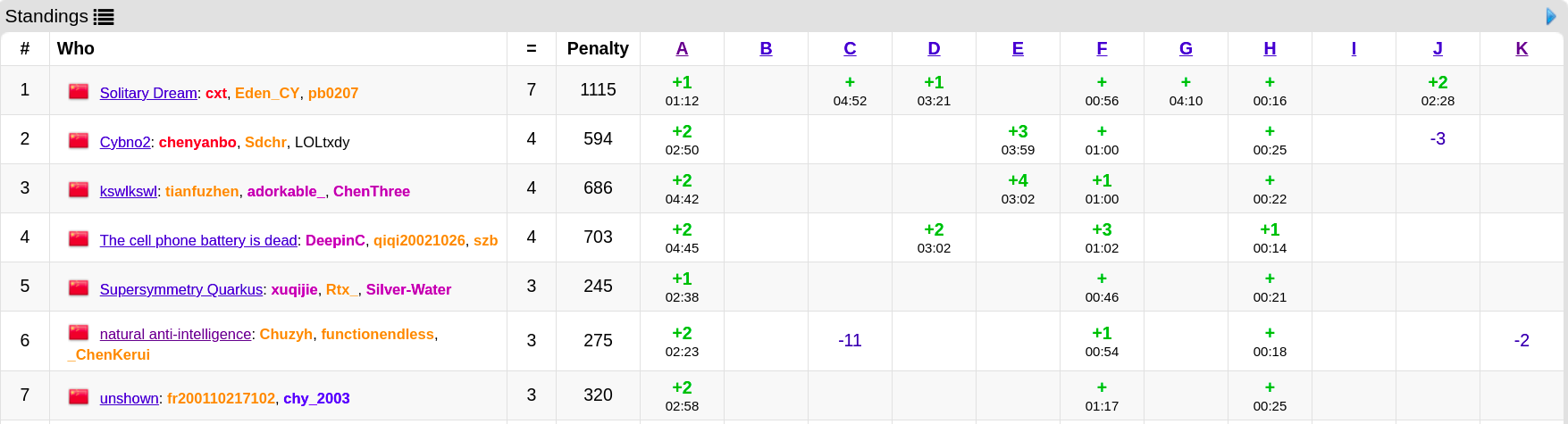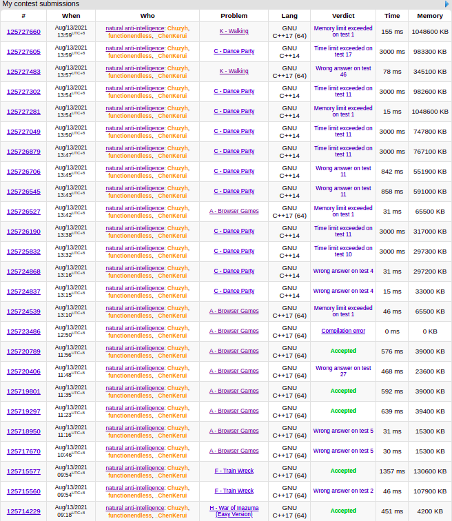 今天大家依旧按照国际惯例开题,fx看出A是原题加强后开始思考如何卡空间,ckr在中间随机开题,czyh跟榜签到。H1Y18,F1Y54,之后fx开始写A的卡空间做法,czyh和ckr到处开题,fx写完后WA了5,并且对拍失败,之后fx随手造了样例把自己叉了,然后获得了MLE30,继续卡空间,在终于卡好的时候空间限制调大,所以尽管try了6发,A3Y143。之后ckr信仰C,fx和czyh狂推K,都GG了。
