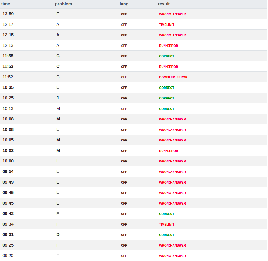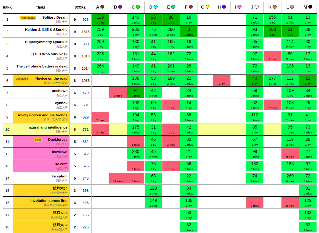 开局依照国际惯例开题。czyh先开出D然后自己上去写,写完之后过不了样例于是换fx上去写F,但fx没有睡醒,WA了三发才过,都是因为想的和写的不是一个东西,在调试过程中czyh继续写D,D1Y31,F4Y42。接着换ckr上机写L,但写完后怎么都过不去,于是拉czyh一起调试。fx在他们调试的间隙写M,但因为没睡醒所以又WA了三发,M4Y73。写完M后fx看不下去了于是把czyh踢下去看别的题然后和ckr看L,期间czyh开出J,J1Y85。fx终于读懂了ckr的代码并指出了一个问题,然后czyh和ckr根据这个调了一调(似乎又引出过别的问题?)就过了,L7Y95。之后三个人轮流交换A,C,E。czyh胡出C的做法后丢给ckr写,然后fx和czyh主要开始想E,但没有什么实质性进展。ckr在日常贡献一发数组开小罚时后过了C题,C2Y175。之后czyh和ckr开始想E,fx主要想A。E出了做法后继续丢给ckr写,fx和czyh胡A,胡到一半ckr表示E调不出来了于是czyh回去调E,fx继续想A。但最后两题都没做出来,以及赛后czyh开始喷ckr的DEV调试技巧,作为emacs人的fx在旁边看戏。