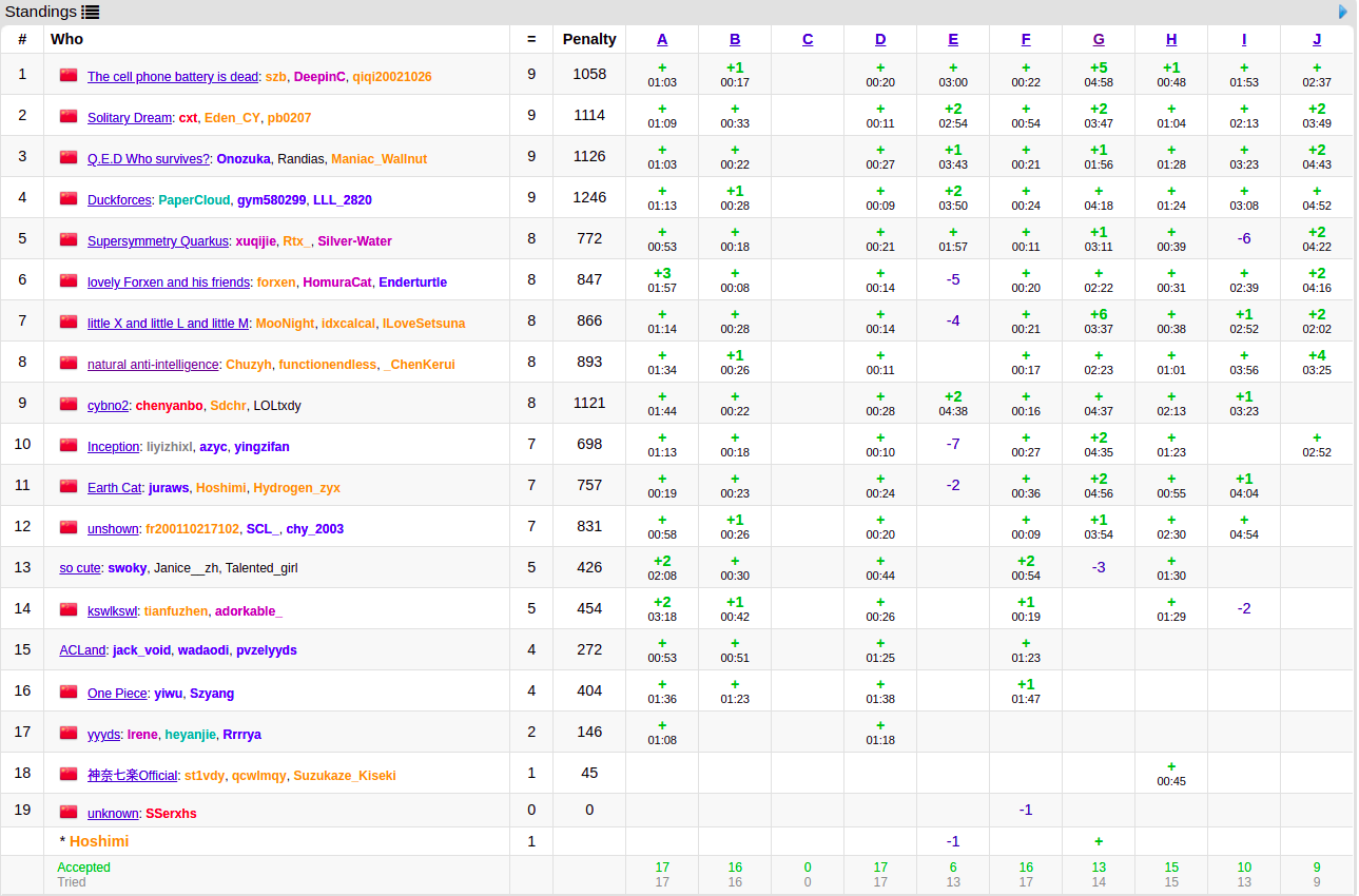 开局依照国际惯例开题。3min后czyh写完A题暴力,开始打A的表。fx把A丢给czyh后跳过看起来毒瘤的BC去看D然后签了D,'''D1Y11''',听了ckr的F的结论后fx又把F签了'''F1Y17''',在此前间czyh跟榜把B签了'''B2Y26'''。然后就进入了漫长的中期,之后三人阅读了所有题的题面并开始同时推H,I,J,唯一在动的只有A题的表。经过了一段时间后fx胡出了I,ckr胡出了H然后过掉了'''H1Y61'''。czyh把I题写了后发现过不去样例,重读后发现fx给的题意是假的,得到真题意后fx和czyh都认为它不可做然后去想别的题了。在漫长的思考过程中A的表终于打完了,交上去立刻获得了AC,'''A1Y94'''。czyh发现E题有许多人过了,于是让fx讲一下题意,czyh在理解出了假题意后胡出了一个假的做法,fx似乎没有听懂,但理解了真题意的他没有发现一个简单的结论,用假题意下的结论叉掉了假题意下的假做法;于是czyh陷入自闭。每个人在辗转交流了一圈后,fx看I,czyh看G,ckr看J。贪心大师czyh率先过G,'''G1Y143''',随后fx胡出了I,但czyh拒绝学会,所以只能fx上机写,在15min内写完后开始调试(150min),调到一半ckr胡出J并开始写,代码大师ckr从写到调才用了没多久'''J5Y205''',于是fx继续调I,在调了100年后意识到因为顺序问题要开2n个树桩数组,过了10s后过了样例,但极限数据跑不过,于是czyh自告奋勇开始卡常。这时fx隐约感觉到应该不用树状数组,于是把树状数组改掉之后又过不了样例了,又调了100年才发现自己的sb代码错误,'''I1Y236'''。之后czyh发现E题题意读错了,实际上是个简单bfs题,于是把它丢给了ckr,三人合力搞E(合力:czyh边吃中饭边看ckr写代码,fx在一边一脸懵逼),最后没写完。