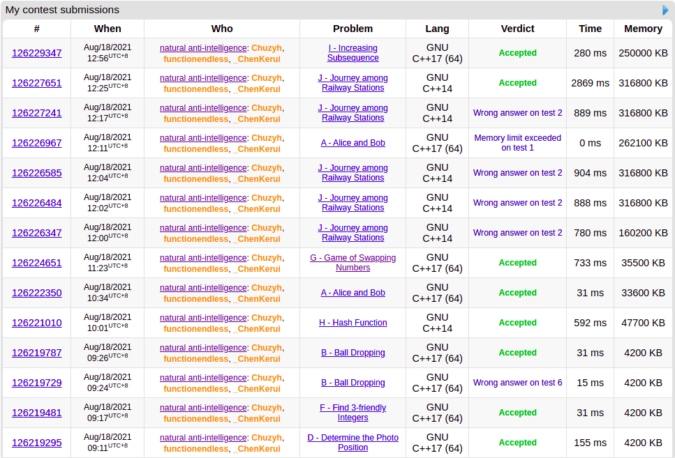 开局依照国际惯例开题。3min后czyh写完A题暴力,开始打A的表。fx把A丢给czyh后跳过看起来毒瘤的BC去看D然后签了D,D1Y11,听了ckr的F的结论后fx又把F签了F1Y17,在此前间czyh跟榜把B签了B2Y26。然后就进入了漫长的中期,之后三人阅读了所有题的题面并开始同时推H,I,J,唯一在动的只有A题的表。经过了一段时间后fx胡出了I,ckr胡出了H然后过掉了H1Y61。czyh把I题写了后发现过不去样例,重读后发现fx给的题意是假的,得到真题意后fx和czyh都认为它不可做然后去想别的题了。在漫长的思考过程中A的表终于打完了,交上去立刻获得了AC,A1Y94。czyh发现E题有许多人过了,于是让fx讲一下题意,czyh在理解出了假题意后胡出了一个假的做法,fx似乎没有听懂,但理解了真题意的他没有发现一个简单的结论,用假题意下的结论叉掉了假题意下的假做法;于是czyh陷入自闭。每个人在辗转交流了一圈后,fx看I,czyh看G,ckr看J。贪心大师czyh率先过G,G1Y143,随后fx胡出了I,但czyh拒绝学会,所以只能fx上机写,在15min内写完后开始调试(150min),调到一半ckr胡出J并开始写,代码大师ckr从写到调才用了没多久J5Y205,于是fx继续调I,在调了100年后意识到因为顺序问题要开2n个树桩数组,过了10s后过了样例,但极限数据跑不过,于是czyh自告奋勇开始卡常。这时fx隐约感觉到应该不用树状数组,于是把树状数组改掉之后又过不了样例了,又调了100年才发现自己的sb代码错误,I1Y236。之后czyh发现E题题意读错了,实际上是个简单bfs题,于是把它丢给了ckr,三人合力搞E(合力:czyh边吃中饭边看ckr写代码,fx在一边一脸懵逼),最后没写完。