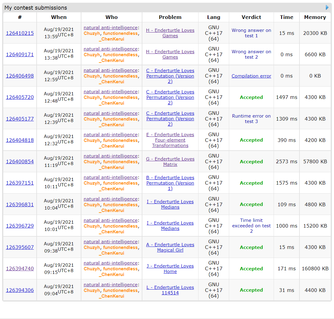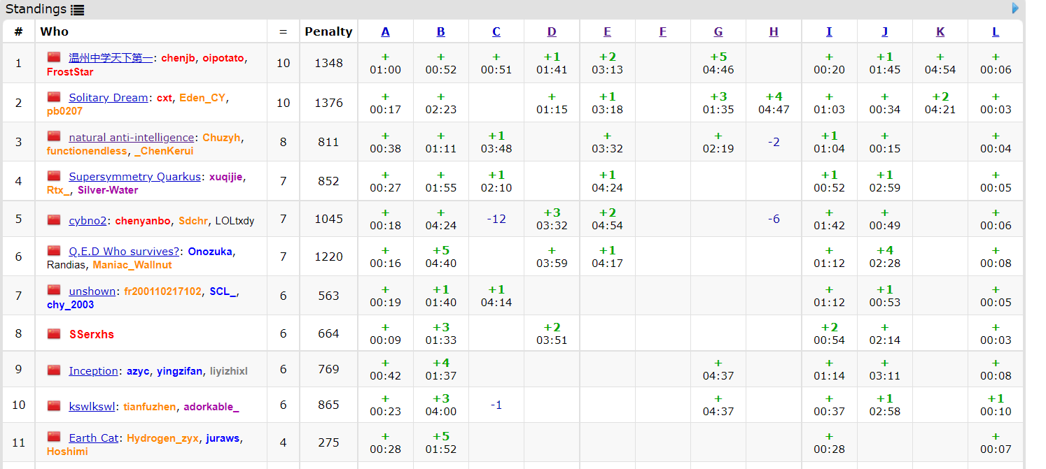 ckr去学校拿档案了,所以这场是双打。开局czyh倒开L1Y4,J1Y15。fx正开发现A是个签到,但调不出来了,场上过了一片之后才慢悠悠地过了A1Y38。ckr想出I的弱化做法,czyh打了一个补丁之后开始写,结果T了一发I2Y64。这个时候cjb突然过了BC,fx开始想BC,很快胡出B做法,B1Y71。接下来陷入僵局fx继续优化B来尝试冲一冲C,czyh被迫罚坐。cjb突然过了G,czyh发现这题也是个可做题G1Y139,然后接着罚坐。一个announcement带来转机,E的题面写错了,czyh接着推一推式子,想出了一个需要求乘积的期望的做法。fx说乘积的期望不一定等于期望的平方,但czyh发现这题里乘积的期望一定等于期望的平方。E1Y212。czyh继续罚坐,fx本地终于卡过了C提交一发RE后C2Y228。