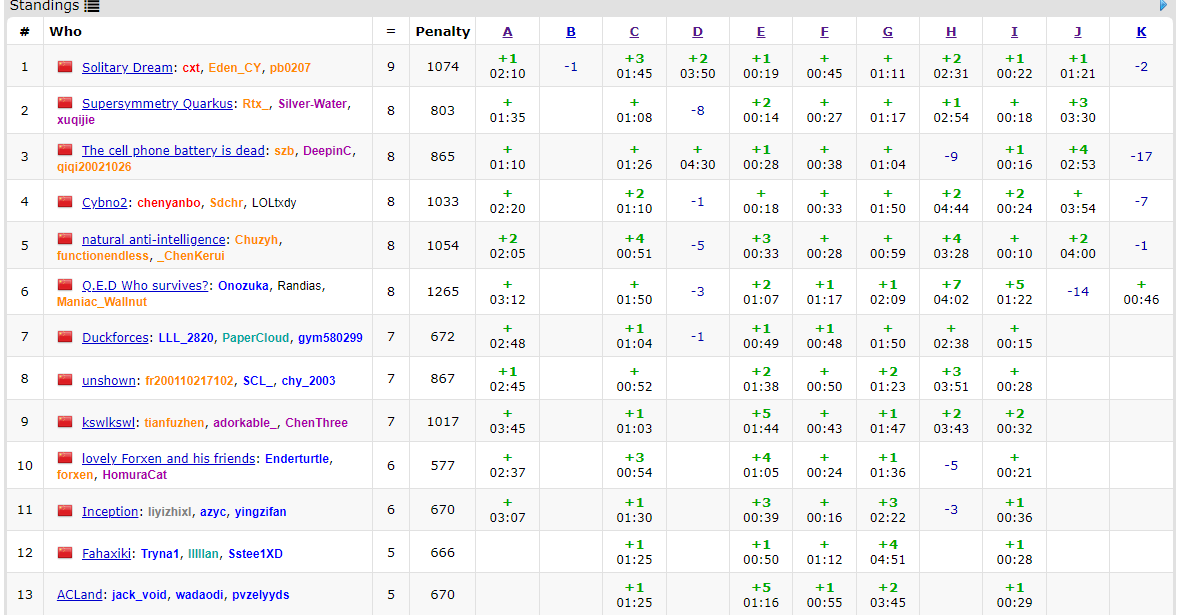 chy:还是太菜了……J题自信地认为只要能写出数据结构就没问题,赛后发现要同时对所有元素取min的线段树合并似乎并不可行(况且我从来没有写过线段树合并)(DDP啊居然没有看出来)……A题贡献了一发罚时完全是因为头铁……写的时候已经发现还要一个前缀和优化了,然后觉得均摊很小,最坏也就根号,所以先勇了一发……果然T了。感觉还需要加强和队友在想法上的讨论,还有感觉这场比赛有点莫名带了奇怪的节奏。