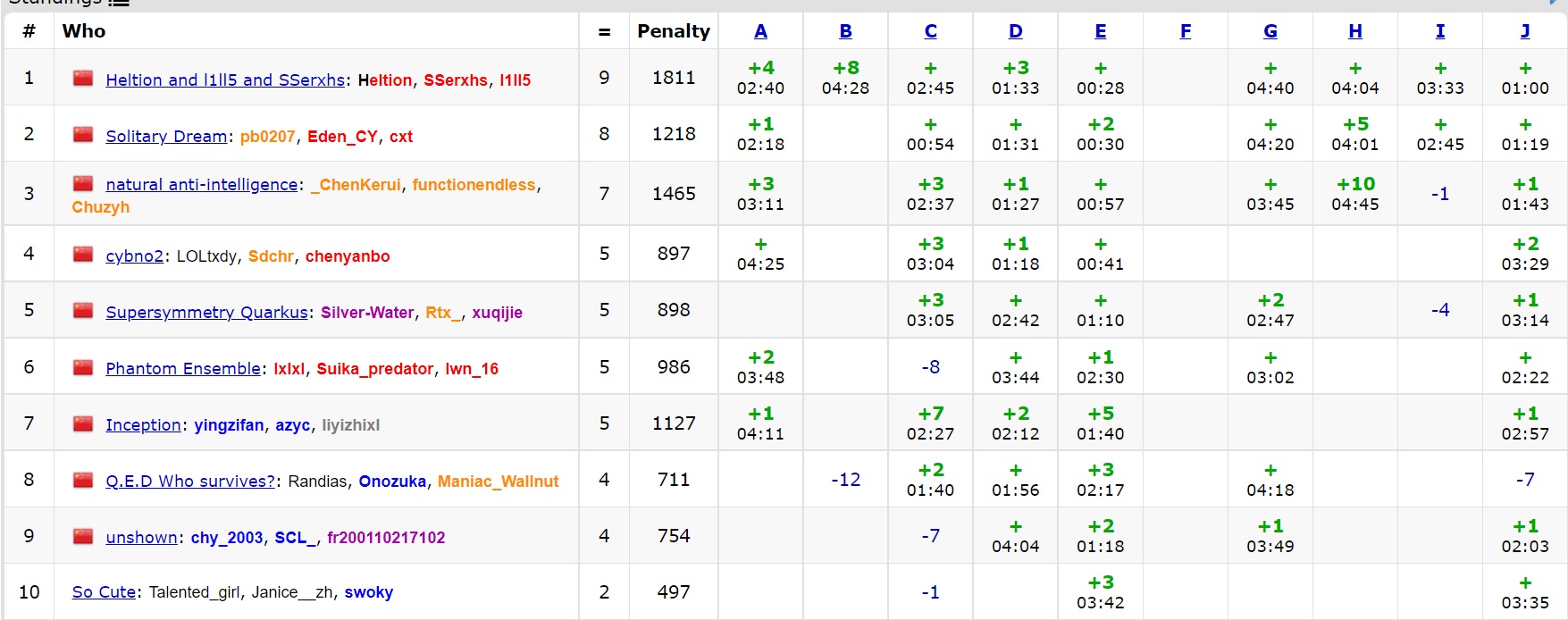 开场五分钟外榜就有队伍过了 E,于是 chy 去看然而不是很会,明确这场是毒瘤场。于是我跟 chy 一起看 E。我想了一个结论,然后 chy 先想出了一个 n3.5 的做法发现过不去,我把它优化到了 n2.5 进而又变成了 n2。然后我上去写,写完 WA on 8,chy 说我的去重是错的然而我大为不解,试着改了一下还真的过了 (1,68/2)。scl 开出了 J 以及读完了 H 的题意(I 没读懂),上去写。我看 C 发现是大 DS 于是果断扔给 chy 去想。开了 D 但不会做,就暂时卡住了。scl 的 J 在 WA 了一遍也过了 (2,123/3),一起想 D。chy 上去莽 C,写了一个小时还没写完。我和 scl 讨论 D 得出一个猜想但不会证明于是先把 D 搁置。我看榜去开了 G,转化题意之后得到了 n4 的做法,不会优化。然而发现模数是固定的,所以可以打表过。打了个 n4 交了一下 TLE on 34 于是放心大胆地打表过了 (3,229/4)。scl 决定莽上 D 结论,结果真的过了 (4,244/4)。最后全队调 C 然而没调完(彩蛋:最后交了个 C 的暴力 WA on 18)