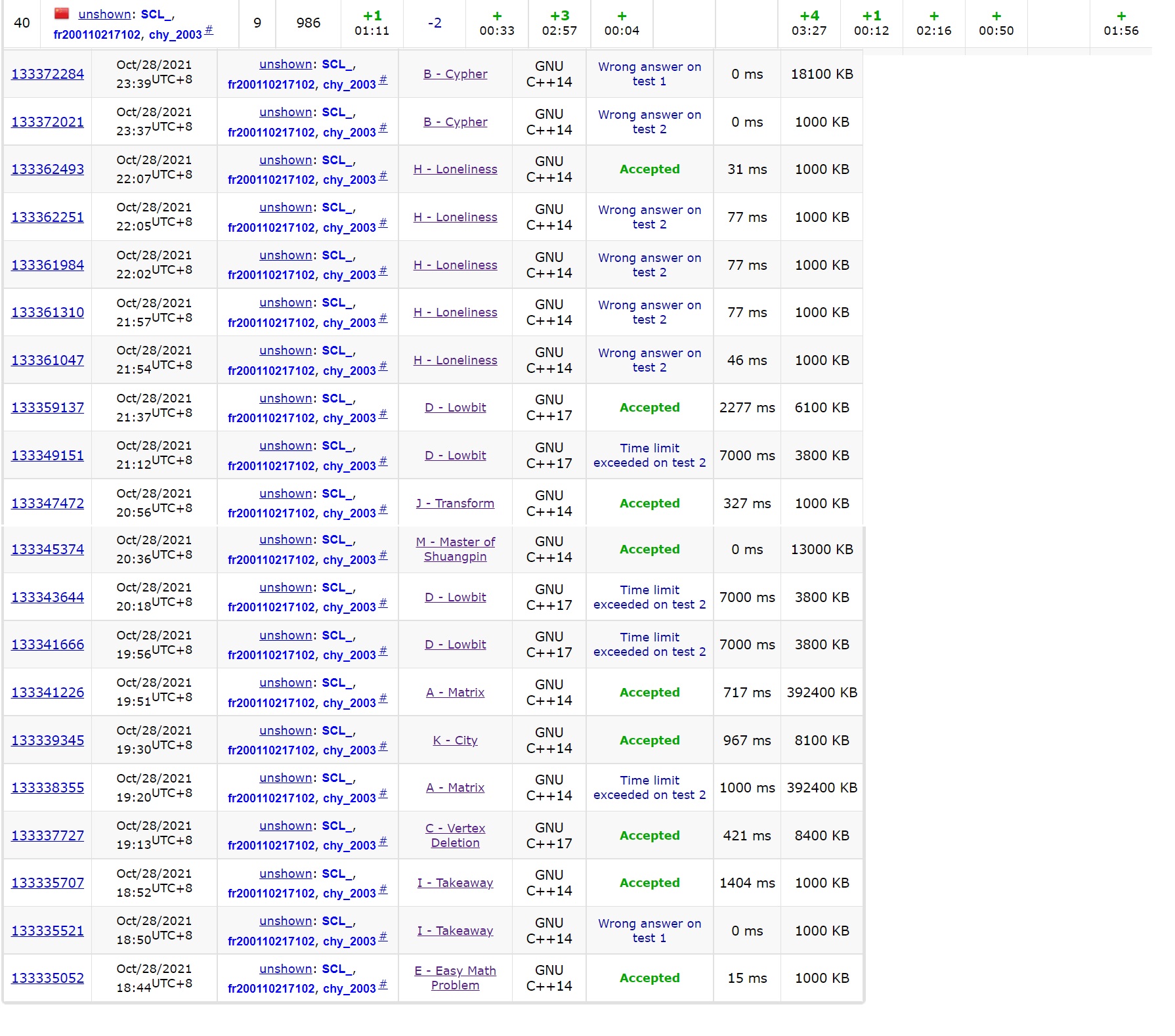 此时场上 B 和 G 过的最多。然而 B 是大模拟,我让队友一起读题写题,自己去看 G。G 是毒瘤排列计数,想了 30min 毫无思路于是弃掉。此时 scl 表示读懂了 B 可以开始写于是让她上机。我在机下读完剩下的两道题感觉 F 好像比 G 可做一些,然而也没想出来。最后 B 也 WA on 2 没调过/zj/zj/zj