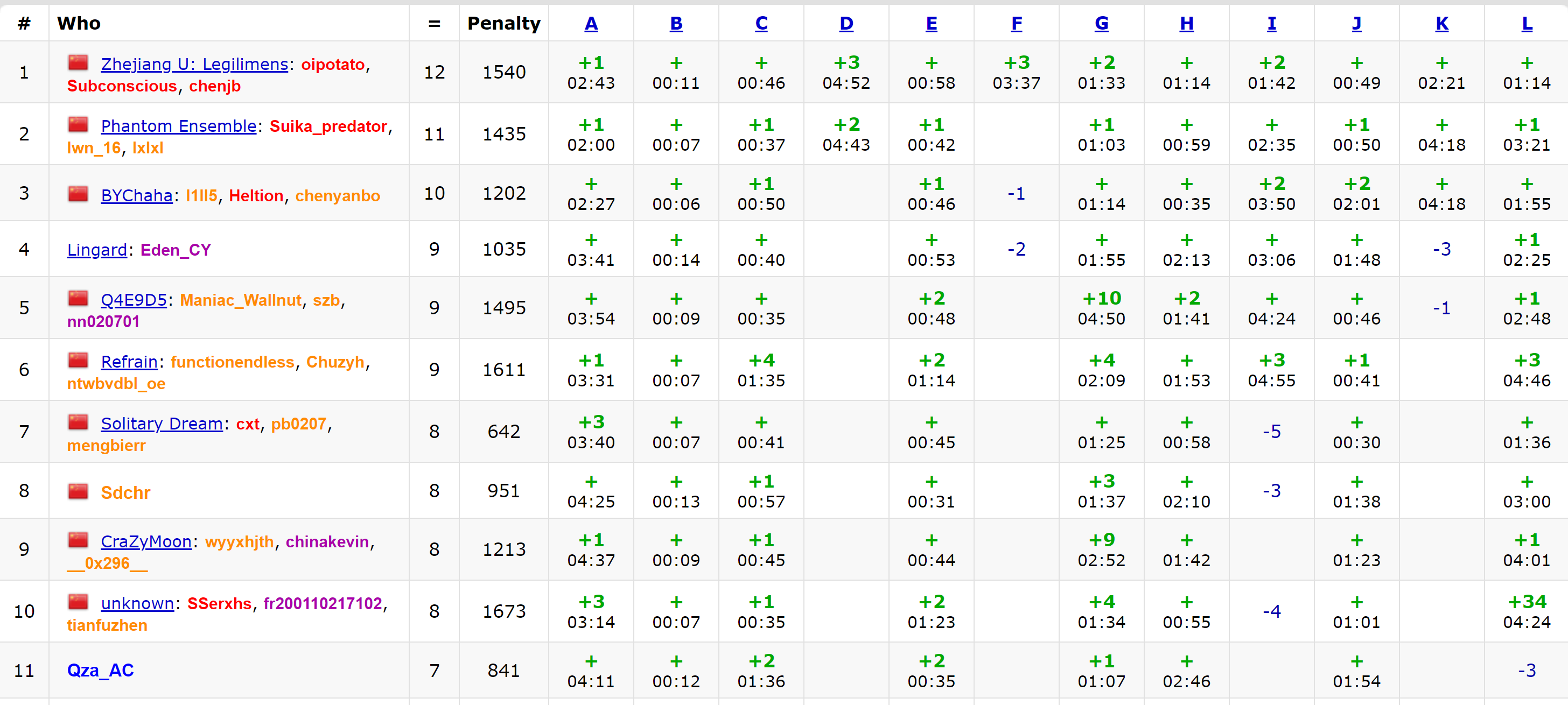 假题演员Szy,开场跟zhw讨论会了A,结果A写起来极其麻烦,于是导致开场签到缓慢,进入2H后才完成了BCEGHJ六个签到题,J题cy猜了一个结论,szy证明了,上去写,一开始wa了,szy发现要先维护单调才有性质,改完过了,zhw开出了I,万幸写了二维树状数组,不然T傻了,过J后zhw过了A,szy在期间自以为开出了F和K,结果F题题意假了,K题有一点小细节处理没考虑清楚,最后FK都wa了