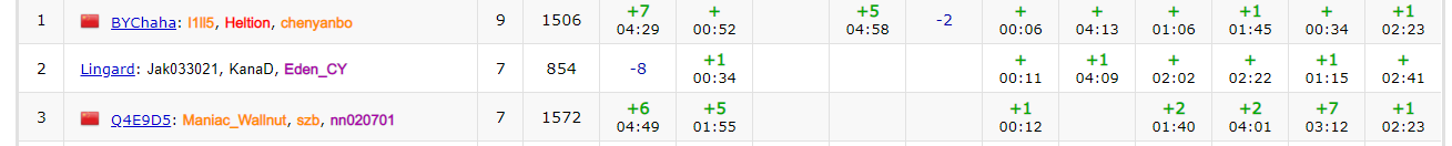 开场cy开了F,zhw开了B,随后zhw发现I题做法,和szy讨论后上机写,然后没过样例,开始调试,cy然后签了J和H。zhw调出了I。此时cy和szy讨论出了K的做法,然后上机做K。szy将A题面给zhw讲zhw上机写模拟题,在zhw写模拟题时cy和szy讨论出了G,并过了G。zhw到最后30min交了A却wa了,调试过后TLE,cy和szy的D题因为板子错了导致没过样例