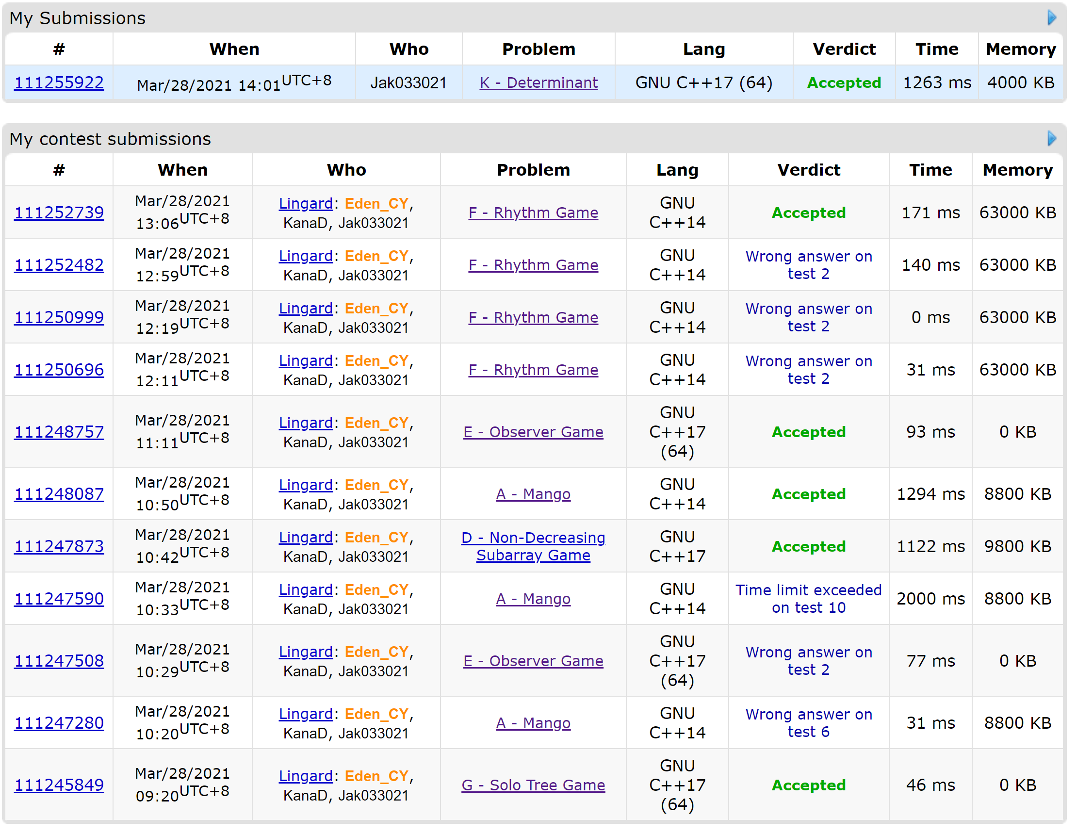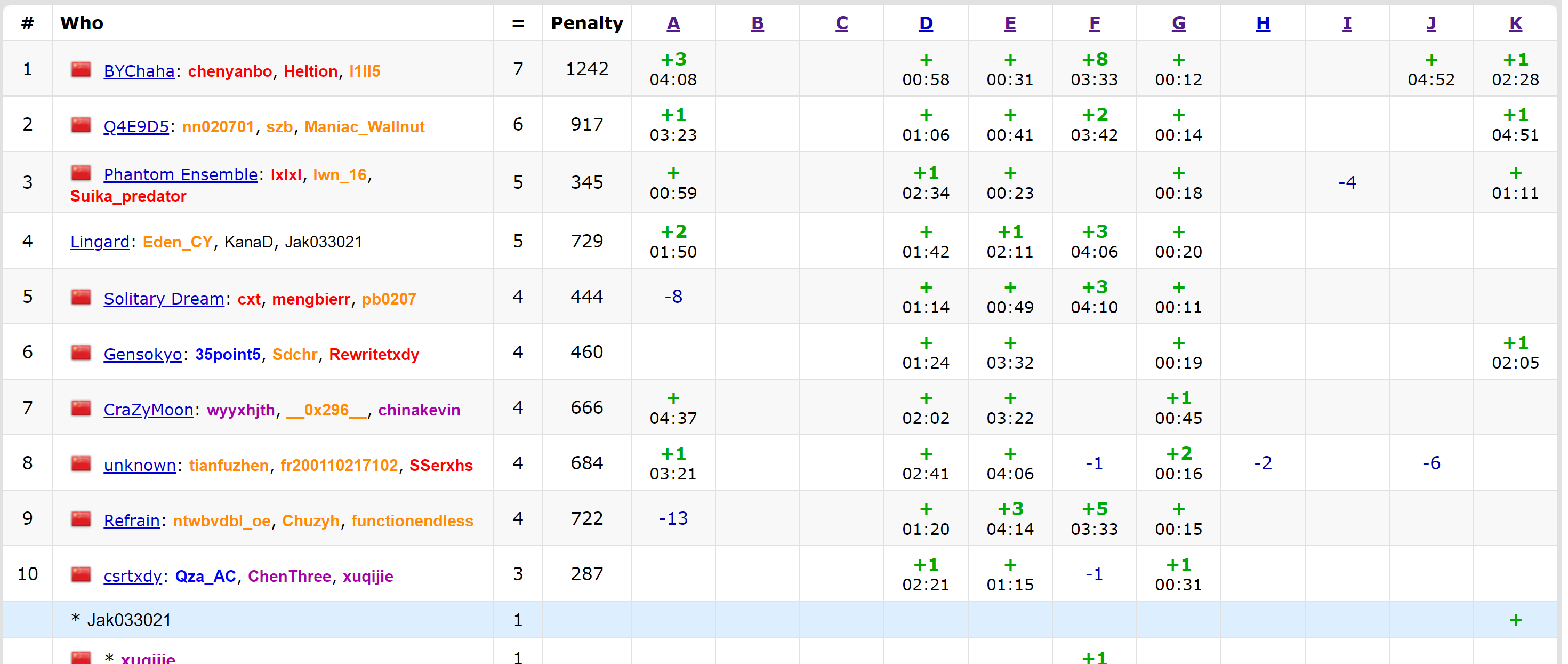 昨天因为输出格式clarification的问题自闭了徐州,今天一开始大家都感到非常累,Szy先签了G,然鹅第二个签到题E大家就不会做了,cy上机开始漫长的写A,期间KanaD开出了D,过了A和D后三个人一起想E,szy终于突然回了,过了E(晚上ljm愤愤不平地说这是假做法),之后KanaD先找出了F的n3 DP,szy表示这肯定是决策单调性优化,但是想了一会发现不对,最后发现漏了一个题目条件,szy证明了一下让cy上机去写,cy调了好一会调出来了,但是KanaD和szy都不会J和K,于是五题结束