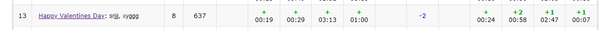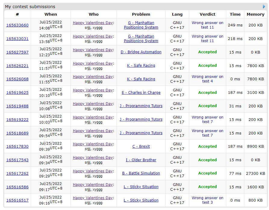 开场lxy签Lwa了一发;然后csr签B,lxy签I,csr签C;接着lxywaJ的同时csr写了个E,在1h左右都过了。接下来csr拎着K,lxy拎着H各挣扎了一会儿无果,又交换着挣扎了一会儿,终于经过将近2h的罚坐,穿插着lxy上班、csr吃早中饭等活动在1wa后过了K。看到榜上有个D,csr捡起来签了一下;接下来lxy写H,写了一会儿放弃去工作了;csr写G,在4h48min提交wa,改了改4h58min提交还wa,于是双双摆烂,等着结束后切号看数据。