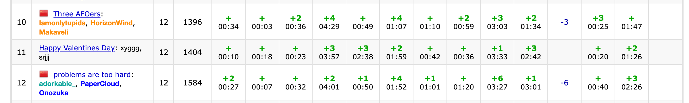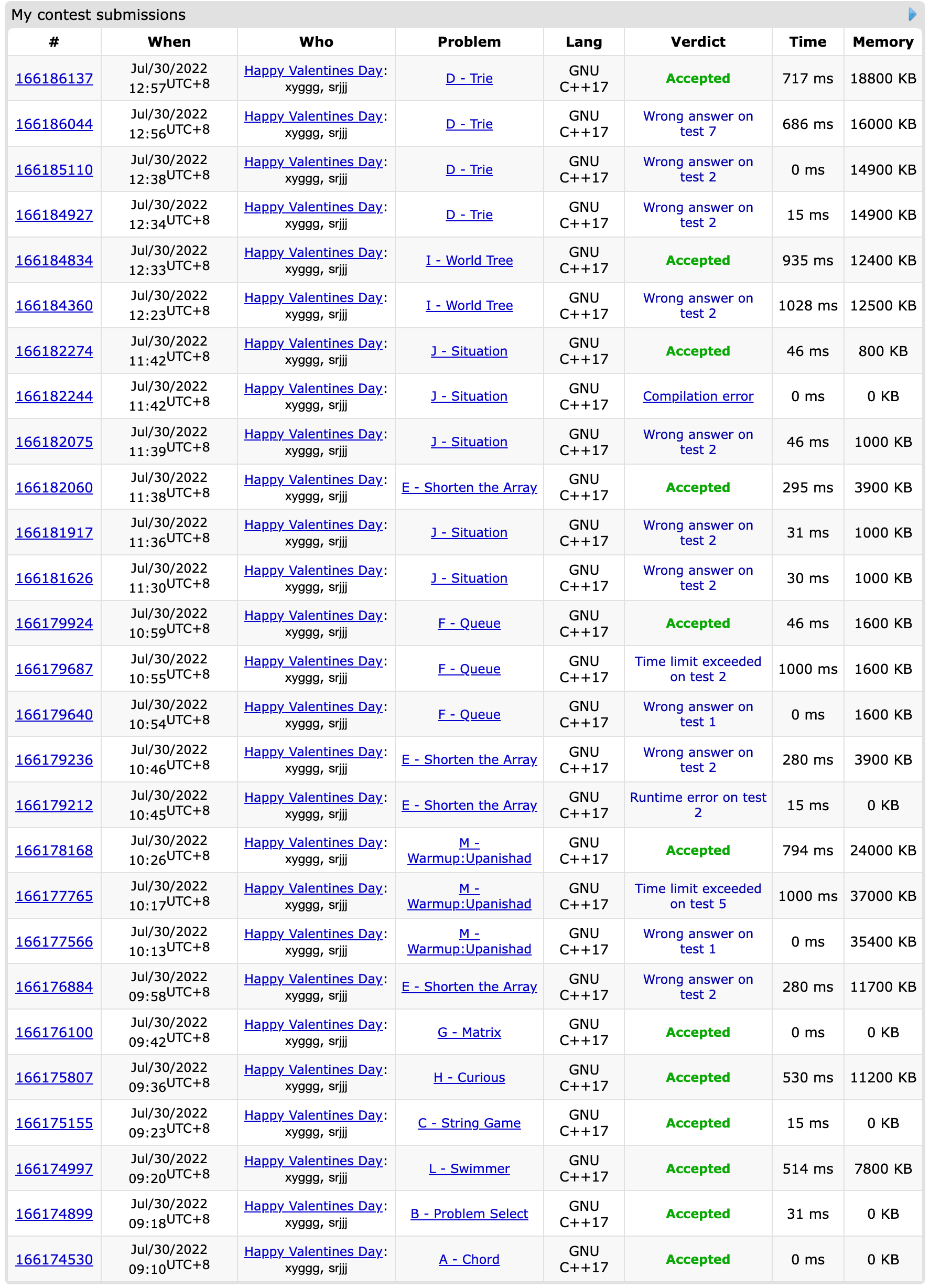 开场csr签A,lxy签B,csr签L,lxy签C,csr签H,lxy签G,都非常丝滑。这个时候榜上有很多E,csr上去猜了一个wa了继续猜。lxy开了M数据结构,wa1一次tle5一次后过了,于是lxy接过E,csr换了个F。csr的F调试信息没删wa了一次,树状数组下标从0开始又wa了一次,然后过了;csr又去开J的博弈,各种地方打错,wa了3发又ce一发之后过了。csr开F和J的间隙里,lxy终于把E救回来了。这个时候两个人都有点行尸走肉状态了,csr写了I的树上dp,lxy写了D的fail树计数。最后csr在赛后5min过了K的样例,改了很久还是tle2,期间发现电话里的lxy好像睡着了,于是csr也去睡觉了><
