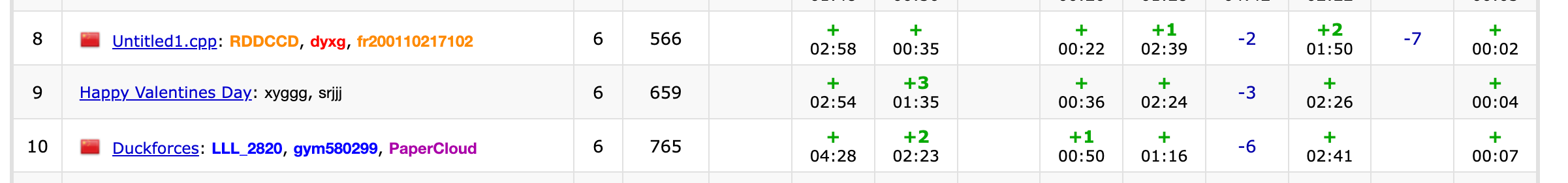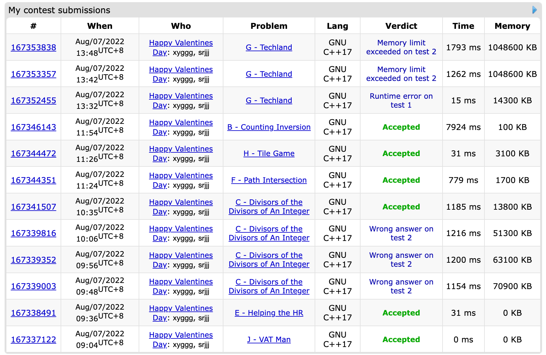 lxy跟榜签完E来关怀csr的C,csr连wa三发后决定assert一下这个两人都不太认识的逆元函数。assert成功才觉得事情不太对,终于发现1e7+7不是质数……于是交给xygg进行重写,笨蛋csr去看xygg说没看懂的H题。