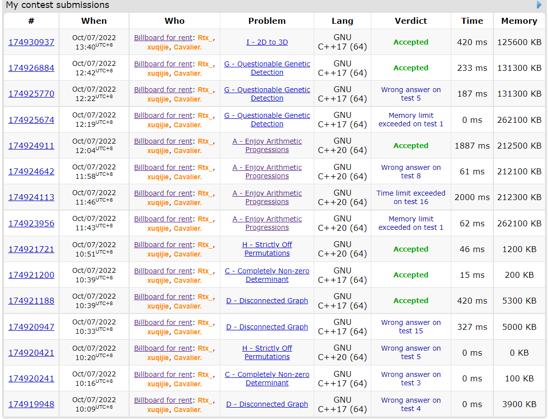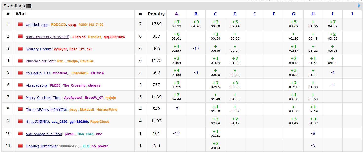开局比较危险,三个人写的三道题都WA了,后来又陆续都过了。然后比较顺利,包括A、G和I。最后实在没有时间做B了,而且对概率论方便的技巧不是很熟悉,只觉得这题玄学。