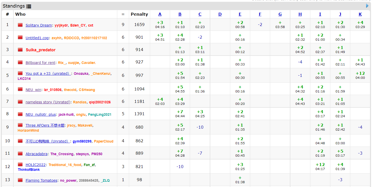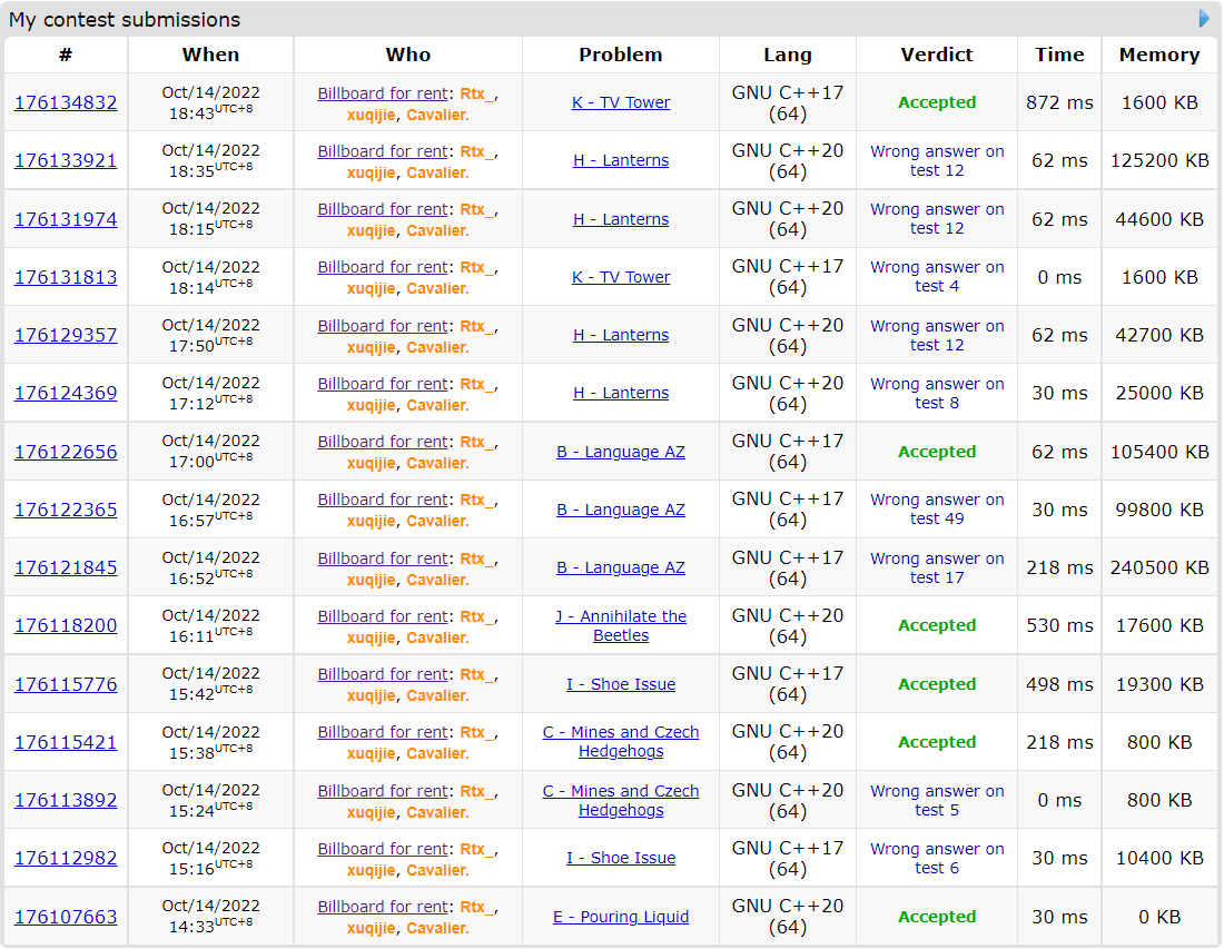 双排,但是结果好像还可以,主要是别人发挥不大好。开局E出的有点慢,之后节奏不错,轮流出题。最后H的做法逐渐发现有问题,逐渐打补丁,导致最后代码比较臃肿,不大好调。K庆幸没有卡精度。最后感觉知道H比较简单的写法,没来及写。