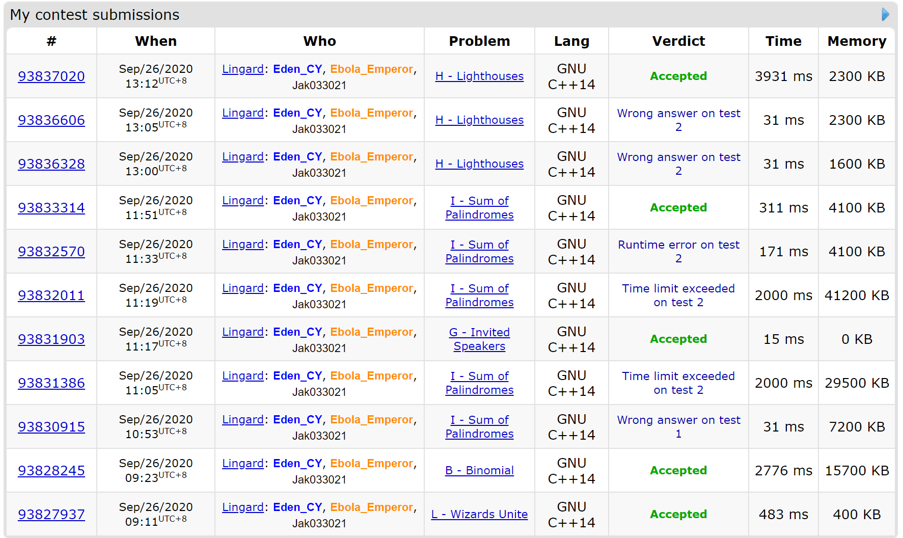 这场总的来说策略上问题不大,主要问题在于卡G和I卡了两个多小时(菜),开场先过了L,随后Eden_CY签了B,之后我和黄文翀想出了I,但是由于对模板的不熟悉,黄文翀写I和调试非常不顺利,与此同时我和CY并没有想出G,导致其中有1个小时机子常常空着,随后2H我想出G交给陈逸,黄文翀随后过I,但此时已经三小时过去了,之后我想出了H,陈逸在252min过了H,但之后黄文翀J没有足够时间完成调试,这场出现的主要问题是题意沟通不畅,常常出现一个人理解错题意想了半天的情况,之前的训练中也有出现过,这有时也跟我英语水平不佳有关系,导致读题时经常甩锅,之后比赛每个题至少要有两个人读过确认,我作为队长应该读除了单开题的所有题目。