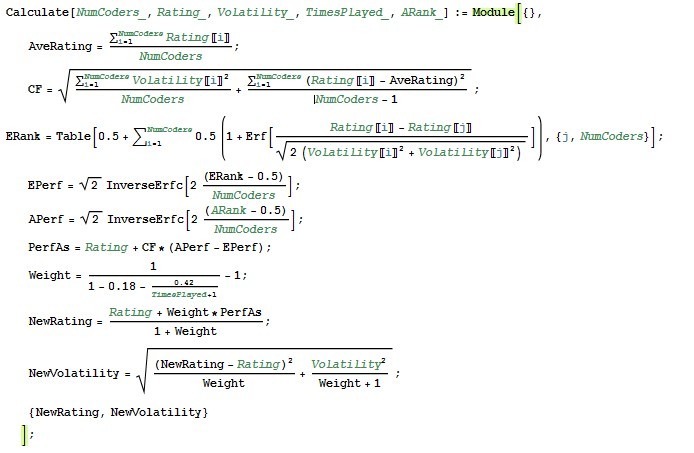 1. 关于K的设定,原文如下:K = 16 is typical for experts in chess, and K = 32 is recommended for beginners in chess. From experimentation, K = 2 was the best fit for the TopCoder data, and best K = 16 worked best for the Halo data. 上面说过了,我把得分改成了名次,而国际象棋里面的得分取值为0, 0.5, 1,而我们这里名次的取值则要大得多,所以K应该取得小为好,现在取值为2(测试过,确实K取2的时候的结果比K去16时候的结果要好不少)。