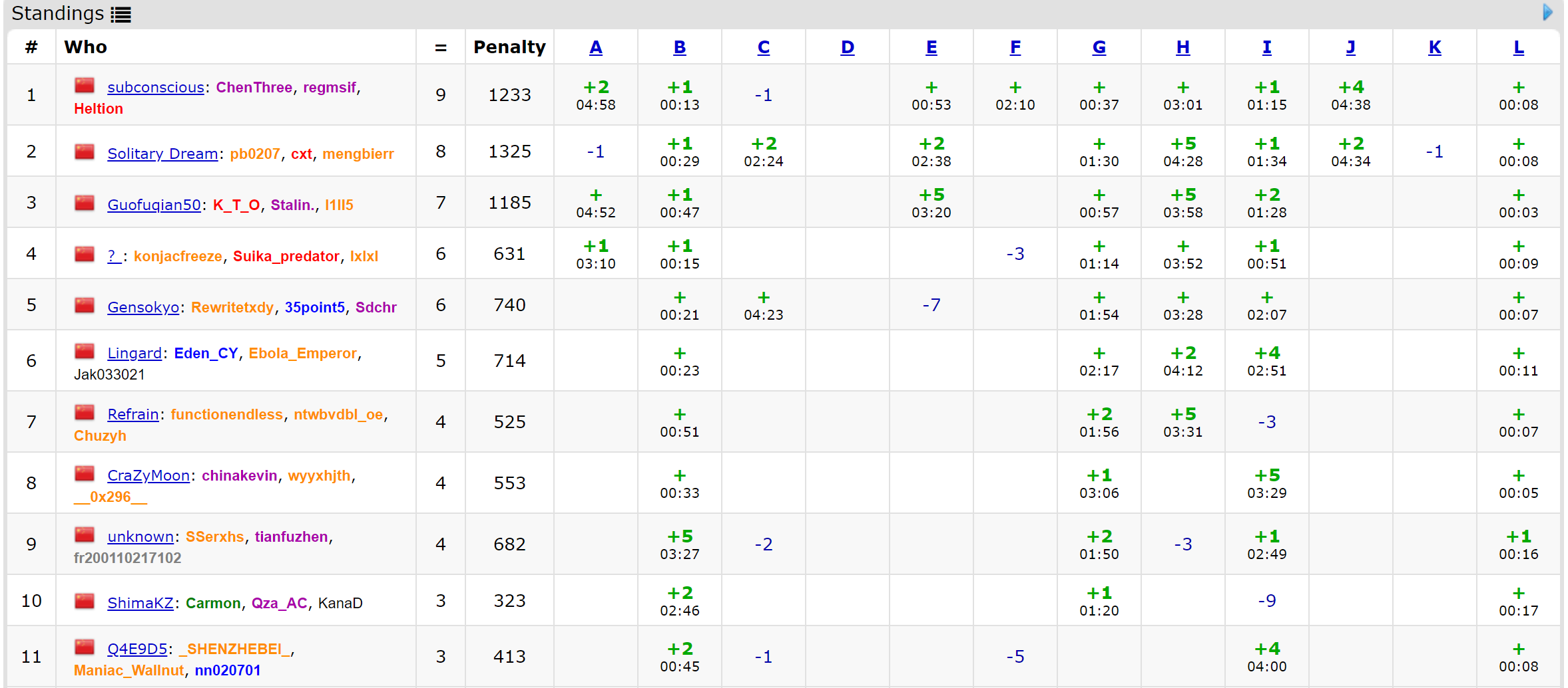 这场总的来说策略上问题不大,主要问题在于卡G和I卡了两个多小时(菜),开场先过了L,随后Eden_CY签了B,之后我和黄文翀想出了I,但是由于对模板的不熟悉,黄文翀写I和调试非常不顺利,与此同时我和CY并没有想出G,导致其中有1个小时机子常常空着,随后2H我想出G交给陈逸,黄文翀随后过I,但此时已经三小时过去了,之后我想出了H,陈逸在252min过了H,但之后黄文翀J没有足够时间完成调试,这场出现的主要问题是题意沟通不畅,常常出现一个人理解错题意想了半天的情况,之前的训练中也有出现过,这有时也跟我英语水平不佳有关系,导致读题时经常甩锅,之后比赛每个题至少要有两个人读过确认,我作为队长应该读除了单开题的所有题目。